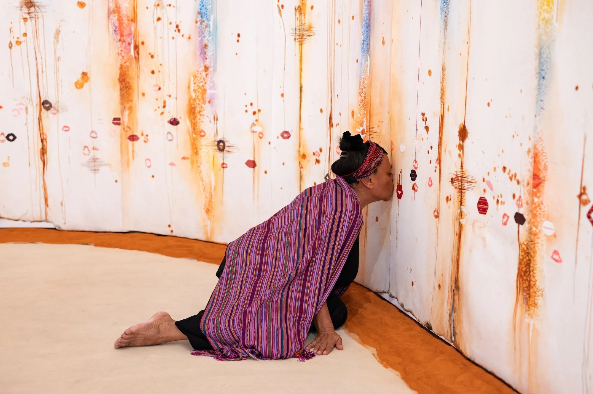 This site-specific installation is rich in its use of local materials such as tais, betel nut, earth and pigments; and there is also a performative element. For audiences who are not able to be there in person, could you describe the space and the significance of your performative gestures?