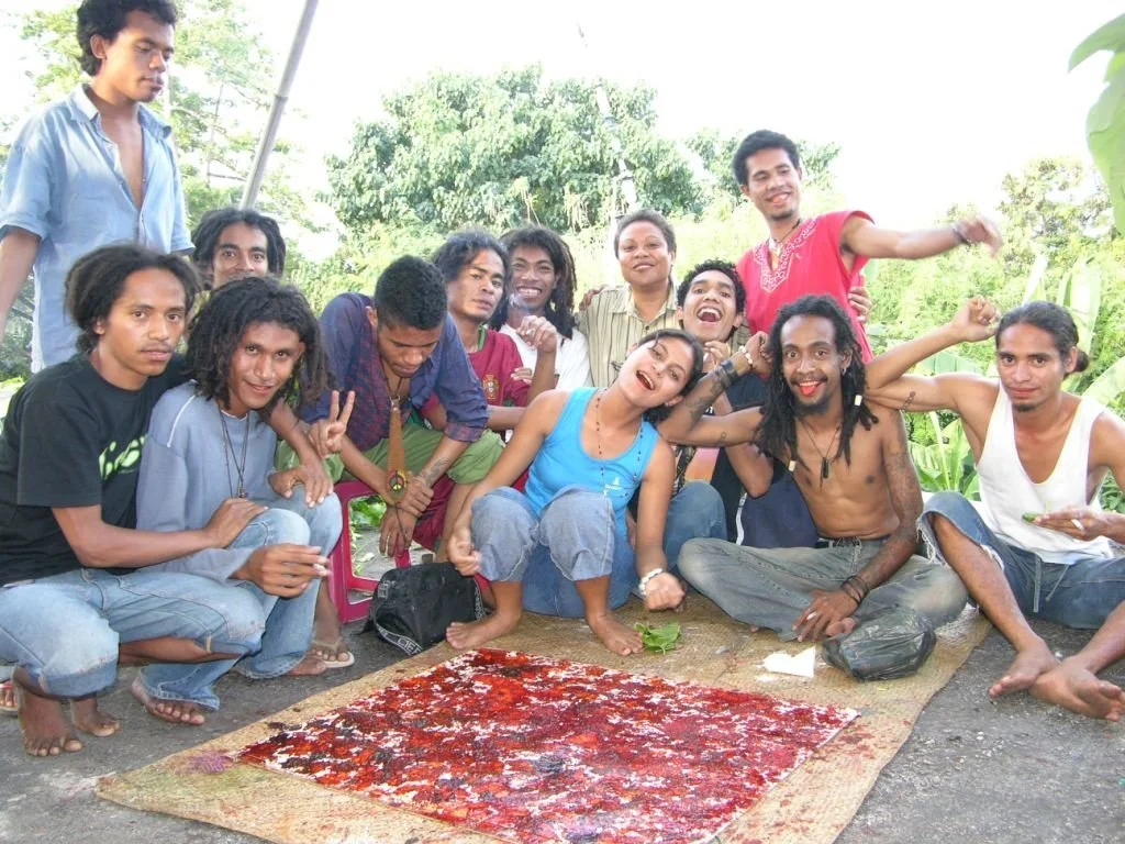 Maria teaching Arte Moris students to paint with betel nut. Photo taken in Dili, Timor-Leste, 2008. Image courtesy of Maria Madeira.