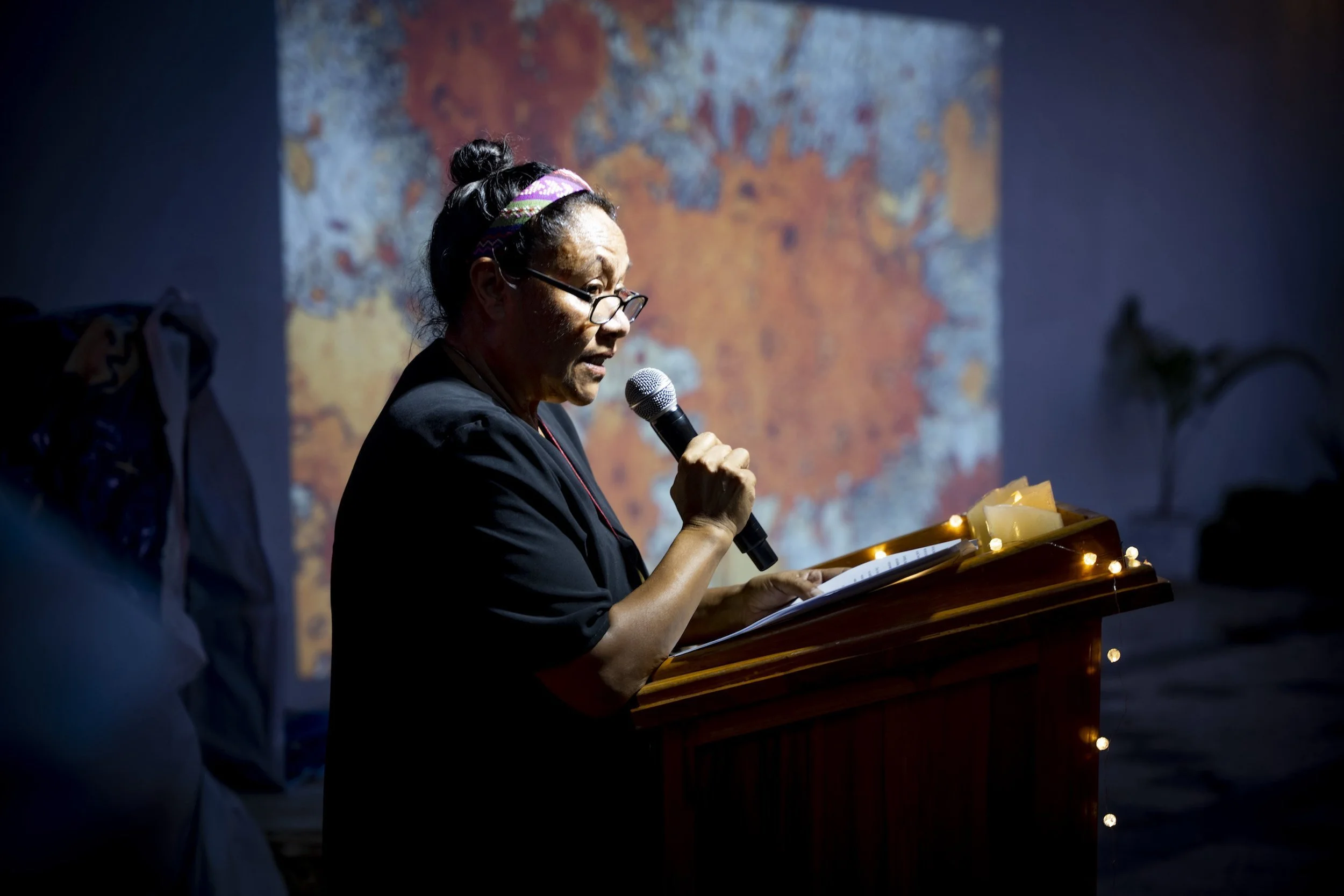 Maria giving a speech at the opening of her exhibition Flowery Talk, Dili,Timor-Leste, 2023. Photo by Juventino Madeira. Image courtesy of Maria Madeira.