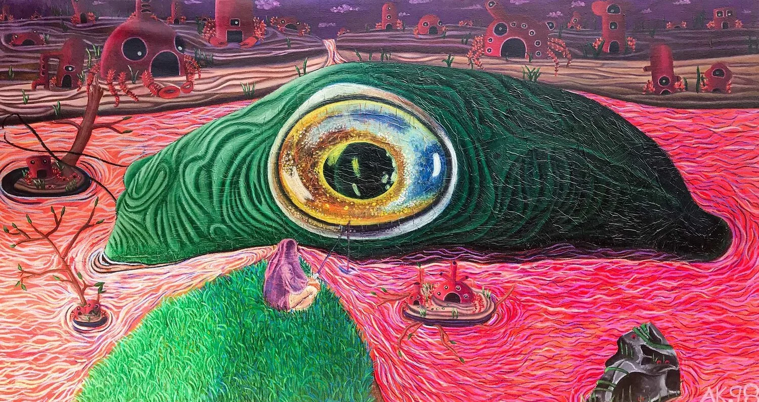 Aina Kurshiah Mohamed Rashid, Ikan, 2020, mixed media on canvas, 91cm x 152cm. Image courtesy of Malaysian Institute of Art.
