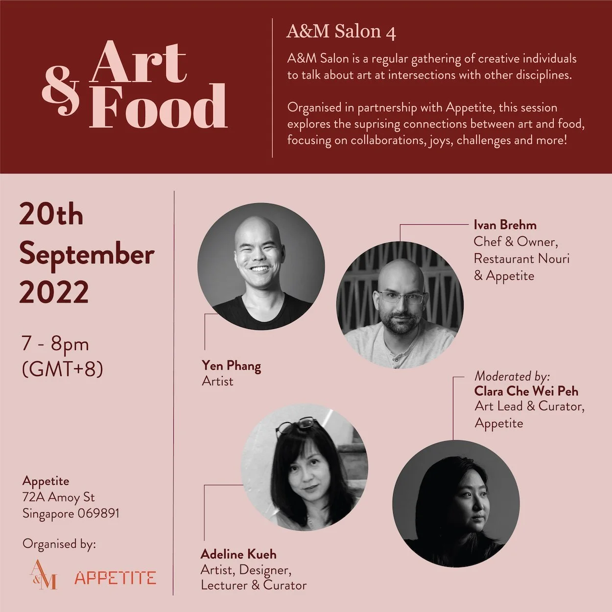 A&M Salon is a regular gathering of creative individuals to talk about art at intersections with other disciplines. Held in partnership with Appetite, A&M Salon 4: Art and Food saw an enriching and light-hearted discussion among Adeline Kueh, artist, designer, lecturer and curator; Ivan Brehm, Chef and Owner, Restaurant Nouri and Appetite; and artist Yen Phang. The conversation was moderated by Clara Che Wei Peh, Art Lead and Curator at Appetite.