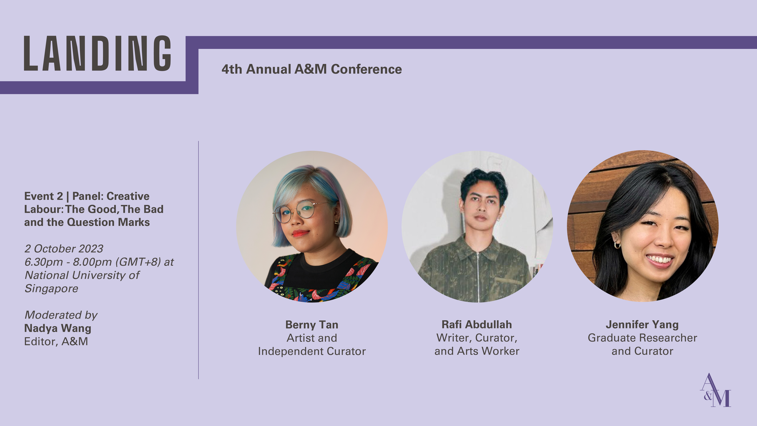 This was moderated by Art & Market Editor Nadya Wang, with panelists artist and curator Berny Tan, writer, curator and arts worker Rafi Abdullah and graduate researcher and curator Jennifer Yang. Jennifer Zoomed in from Sydney. In the lively discussion, the panelists talked about being a part of the creative labour force, overcoming challenges and securing opportunities, and what making this career choice sustainable looks like.
