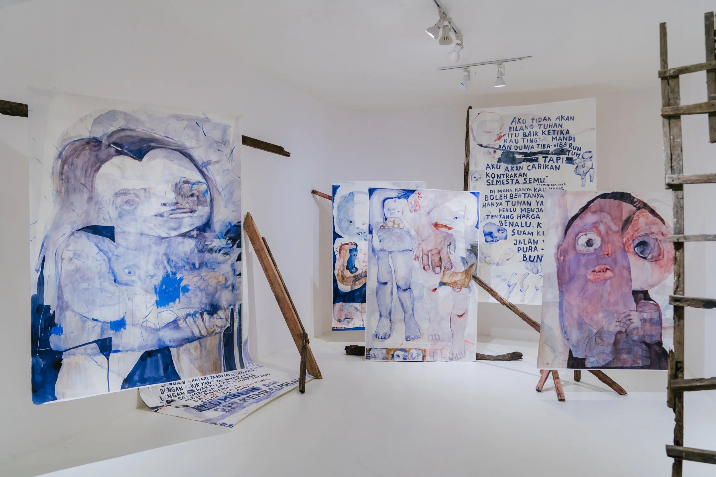 Working in a small space requires compromise and hinders certain aspirations, but ultimately spurs efficiency and inspires creativity. Ella and Ruth’s studio are located in Bandung and Jakarta, two major cities in Indonesia. Land is limited and they both have to make do with relatively small studio spaces within their houses. After moving away from her spacious studio in Depok, Ella now calls her bedroom in her Bandung house, which measures 3m by 2.5m, her “emergency” studio space. Although the space is tiny, she finds advantage in being able to reach all the materials within her studio easily. Her works have become more intimate too. She was inspired to create Domestic Emotions: A Home Within Me (2023) for ARTJOG 2023. The installation comprises small, household objects that signifies the connection she has with her home. As for Ruth, her studio occupies a space right across her bedroom. She too finds advantage in working with limited space. As an example, it necessitated/inspired the tight layout of her works for GUMUL; Segenap Kandidat (2023) at ARTJOG 2023, and her recent solo exhibition Perangai (2023) at Artsphere Gallery, which saw works hung and placed at various locations within each exhibition space, in harmony with each other.