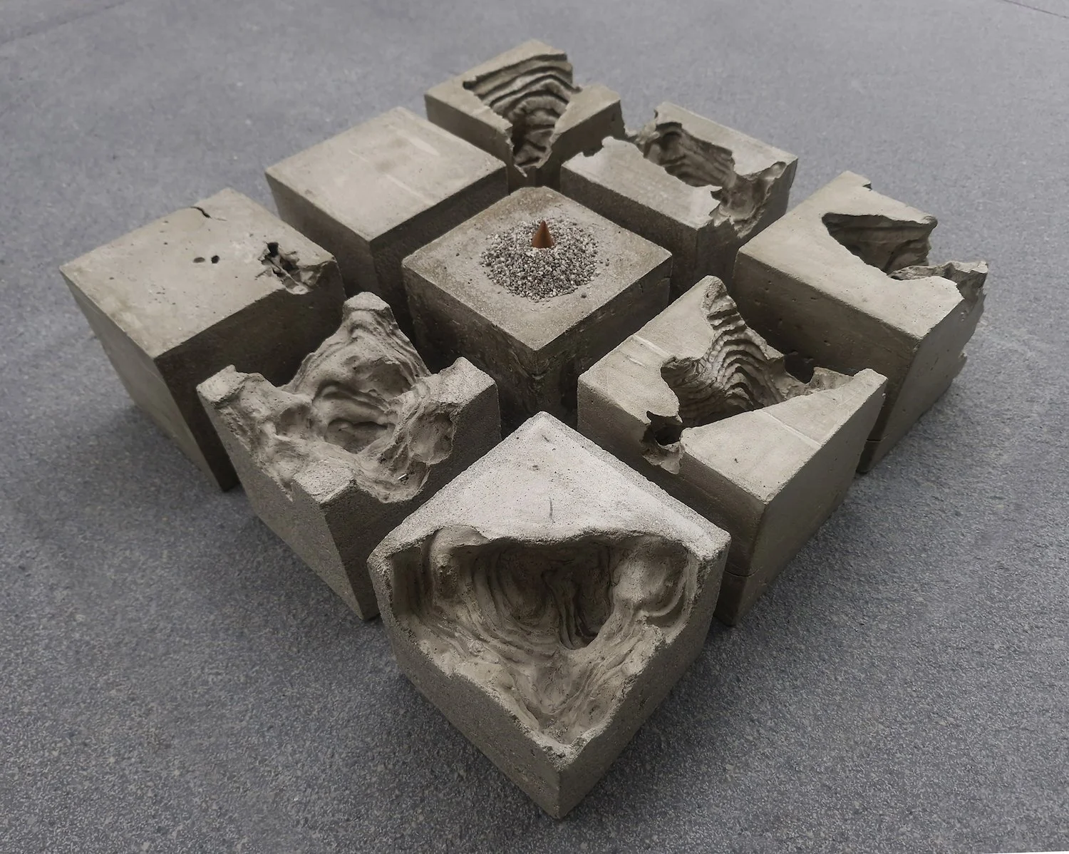 The COVID-19 pandemic led me to explore my own personal faith as coping mechanism. All You Holy Monks and Hermits is about creating nonspecific places for meditation and contemplation. The 9-piece sculpture of concrete cubes with various cavities represent the heaviness this experience brought about the world, and with an attempt to visualise the abstract nature of rituals in clearing spaces. I imagine the smoke from the incense gently carving out terrains through time and persistence. The title comes from the Litany of the Dead which my family and I prayed for 9 days (together, online, in different parts of the world) after my Aunt's passing in 2022.