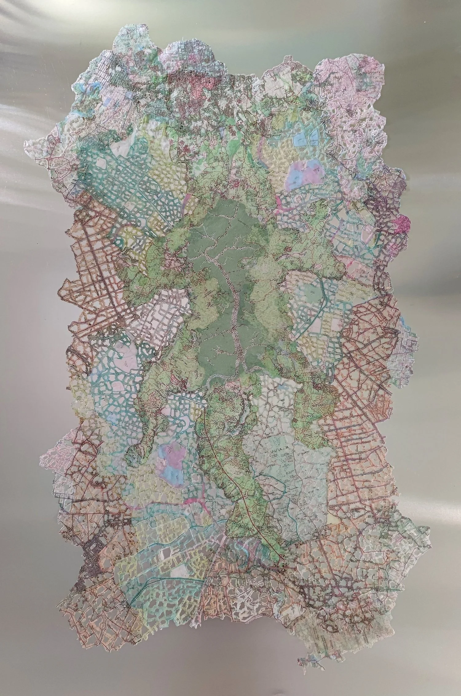 Zelin Seah, U_U A A, washed, burnt, and waxed topographic maps mounting on aluminium, 97 x 150 x 5cm. Image courtesy of the artist and the Sovereign Art Foundation.