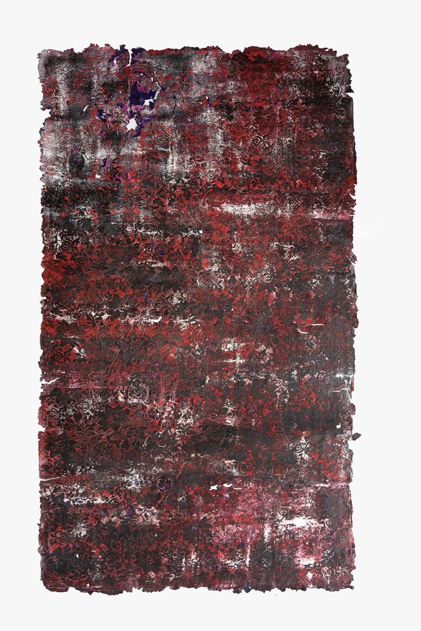 Kanchana Gupta, Open and Close #03, oil paint skins burnt and stripped of French lace, 143 x 80cm. Image courtesy of the artist and the Sovereign Art Foundation.