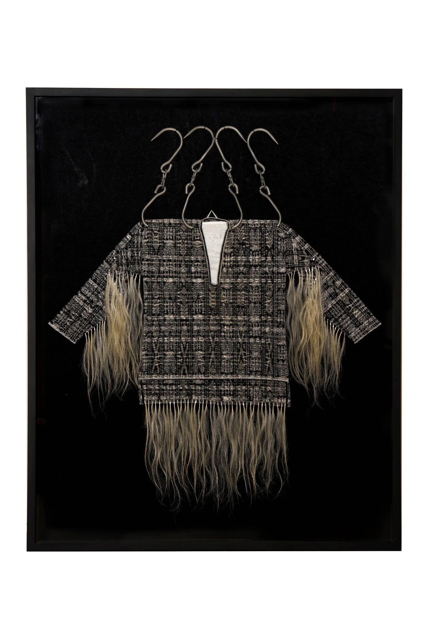 Rocky Cajigan, Pendulum Redux, mixed media of butcher hooks, human hair, Guatemalan ikat textile, embroidery, gauze, aluminum cable crimps, 123 x 150cm. Image courtesy of the artist and the Sovereign Art Foundation.