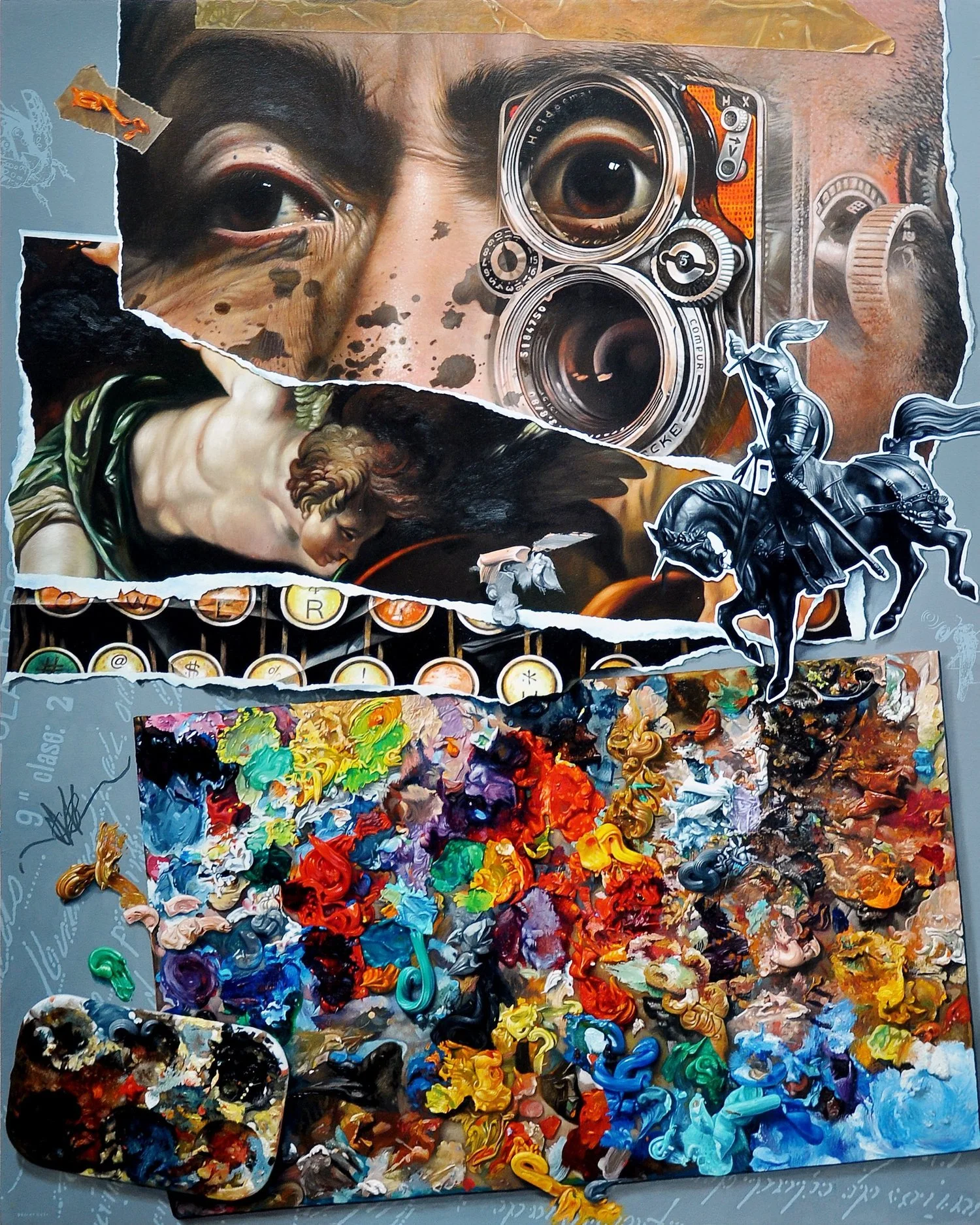 My subject, the palette, signifies my art process, and it is what I value most. Literal and metaphorical, my piece expresses my feelings, thoughts and observations and it portrays and emulates the contemporary plain we’re in... a visually overloaded profound state. The palette represents our human existence, our battles and struggles as well as our celebration of victories through our unparalleled unity.