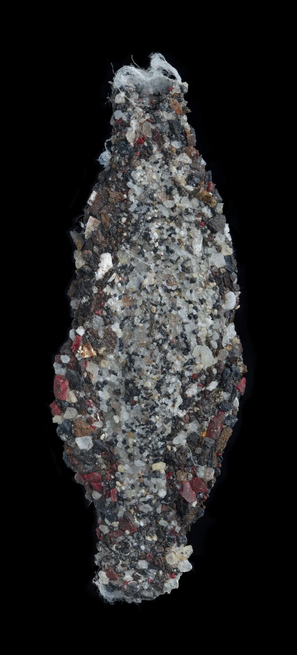 The artwork is a macro-photograph of a larval case left by a tiny insect called the "household casebearer." A close inspection of it reveals a topography of dust, involving soil particles, microplastics, organic and synthetic fibrous materials, and others. These are matters perceived as waste from an anthropocentric perspective, but are nonetheless woven into the larval case, enabling an emergent form of life. Magnifying the case immediately distorts the scale of our perception, where dust can be appreciated as beautiful, and microplastics as rubies.