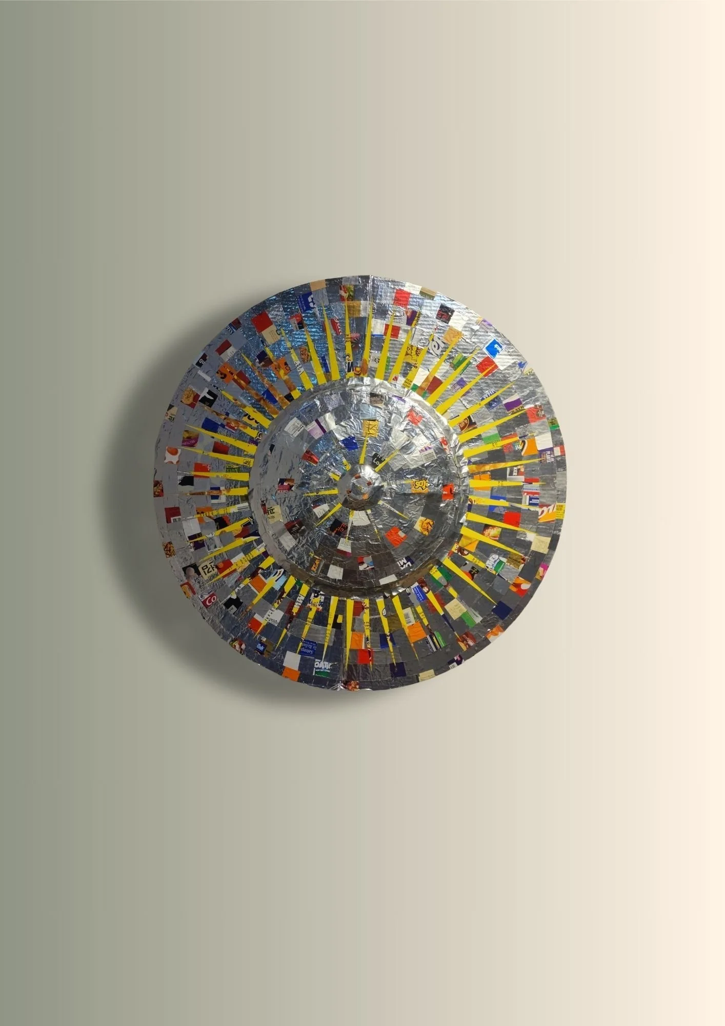 Representing the themes of migration, resilience, and cultural identity, Pasalubong 06: Determination takes the form of a pre-Hispanic Moro ethnic shield. Traditionally a symbol of protection and strength, this piece reimagines the shield using a shipping box colloquially called a "Manila box" –a common box used by overseas Filipino workers to ship a box full of souvenirs–as its ground/foundation, then fashioned with packaging from imported and local goods. It reflects the pasalubong, or souvenir culture, where gifts serve as a bridge between Filipino migrants and the families they leave behind.