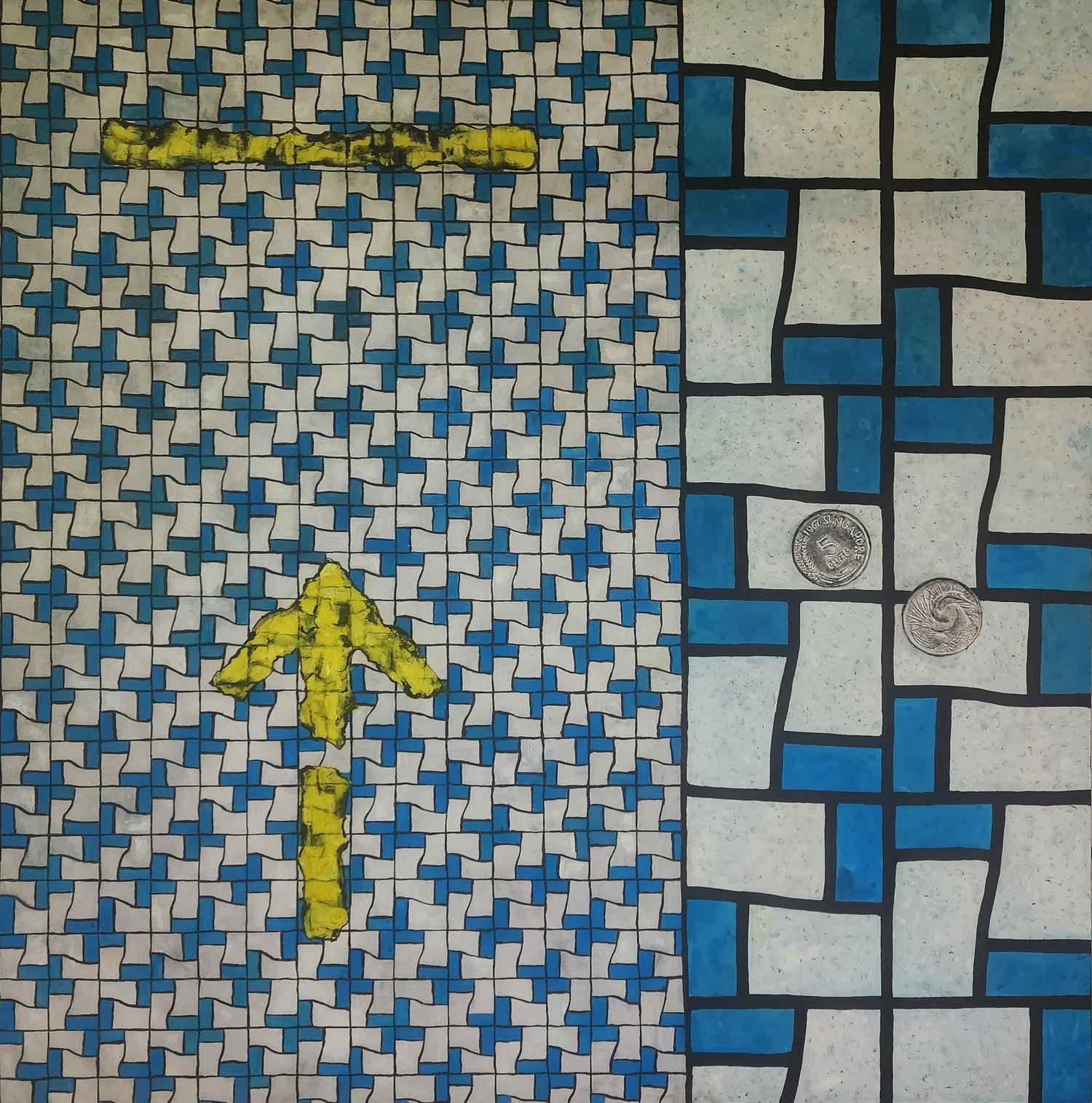 Using everyday objects like floor tiles, yellow vinyl stickers, and coins is a way to elevate these mundane materials and turn them into symbols of value, resilience, loss, and reflection. It’s a poignant tribute to both the struggles of individuals and the strength of communities during such a challenging time.