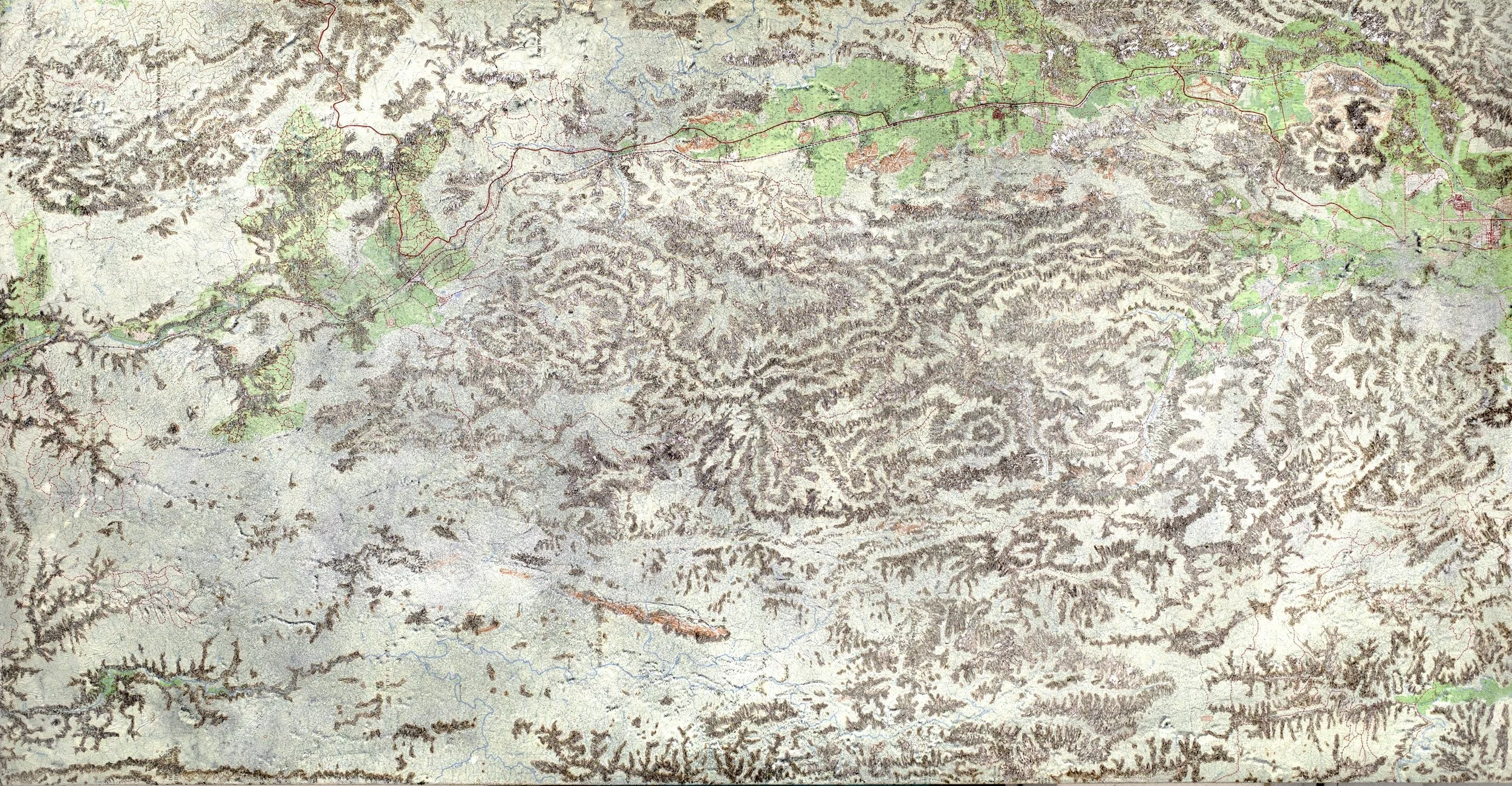 Zelin Seah, It's just some scratches on my back, 2024, topographic maps washed, transferred, carved and burnt with soldering iron onto aluminum, 116 x 60 x 2cm.