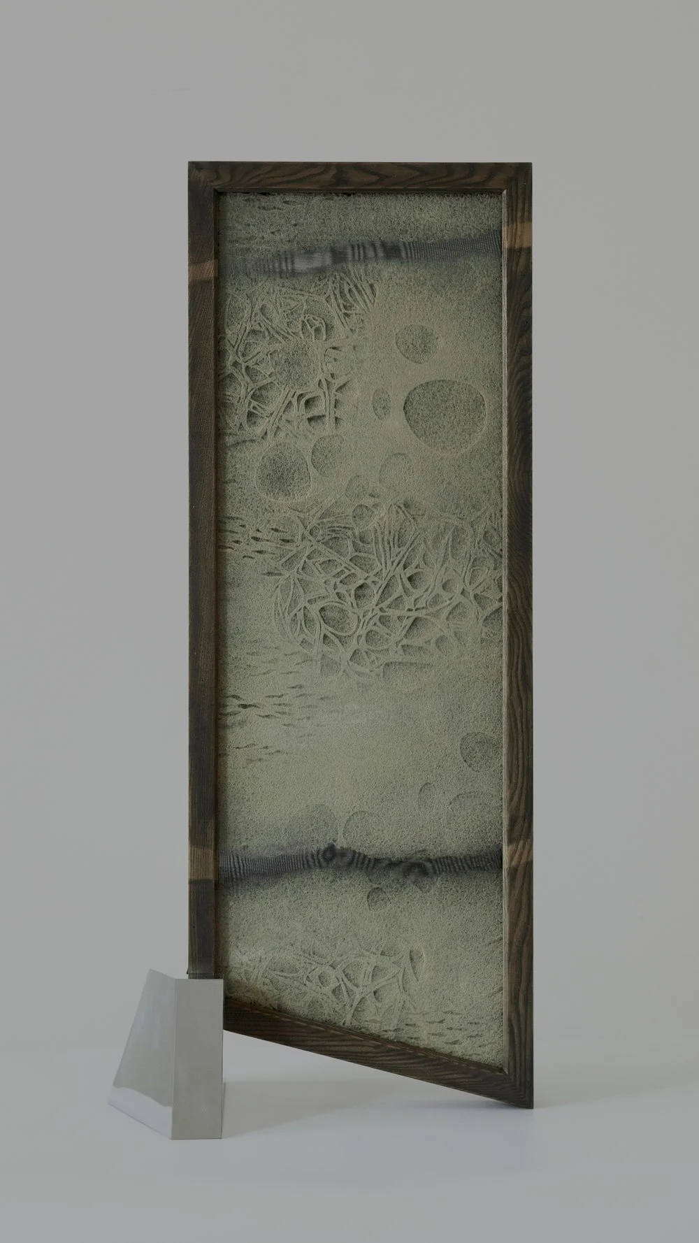 Ngo Dinh Bao Chau, Diagram of the Repetition, 2024, paper powder on silk, wooden frame, stainless steel, 50 x 110 x 28cm.