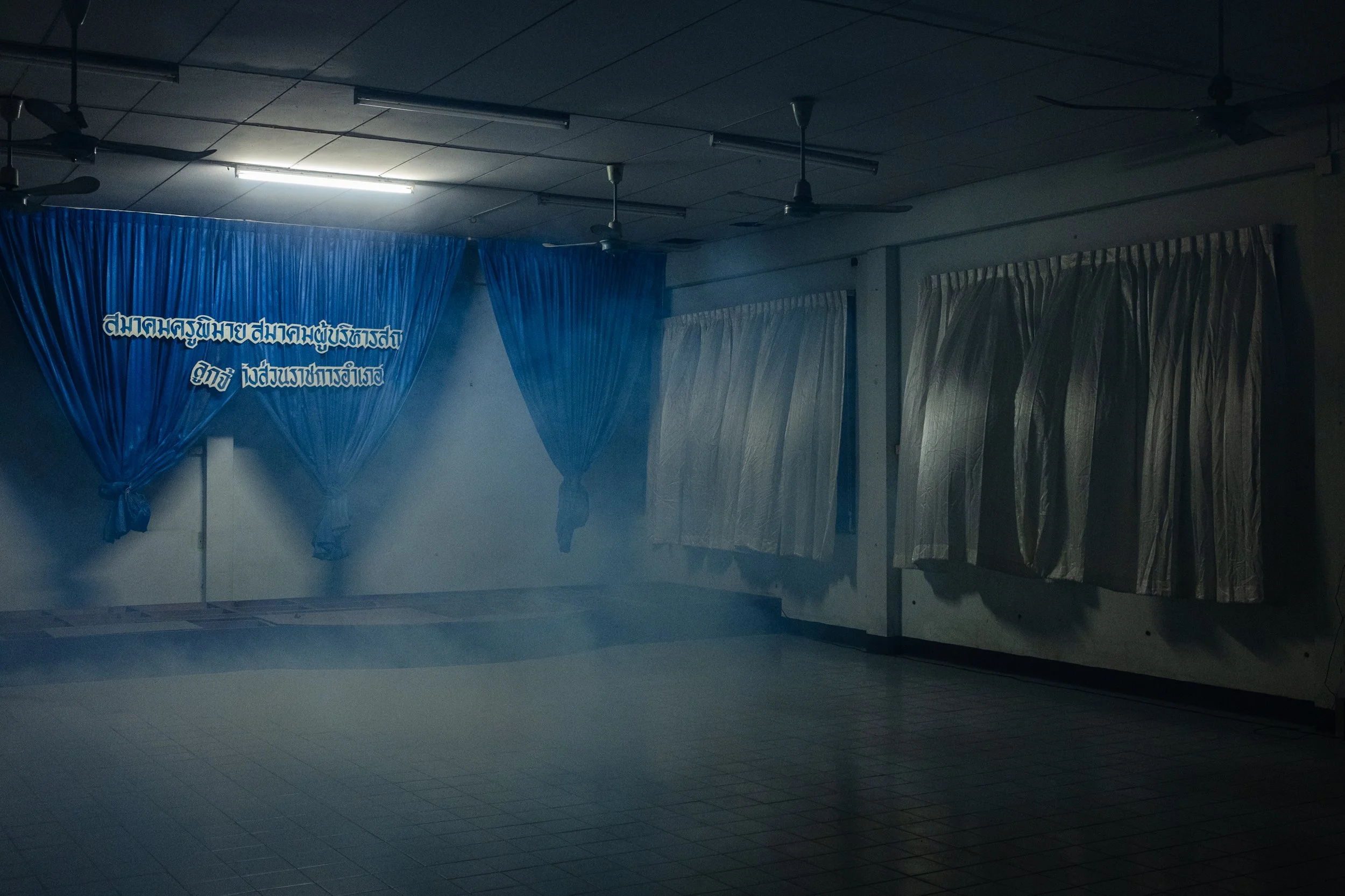 Kham-on’s video, light and sound installation, The Storm That Took Everything (2025) was nestled in the rooms of Phimai Teacher’s Association building. Walking into the 1960s building, one would probably choke from all the dust that covered rows of framed certificates. Those gold-lettered papers announced that the teachers were proud members of the paramilitary Village Scouts founded in the 1970s, a prime example of some Phimai locals being swept up in anti-communist propaganda. Maybe British historian Carolyn Steedman was right when she proposed that dust in libraries and archives were literally causing the archive fever. Here, it was the dust mixed with sand that was hard to shake off. A sandstorm must have visited the building, but the surges of wind seem to have left everything in its original place.