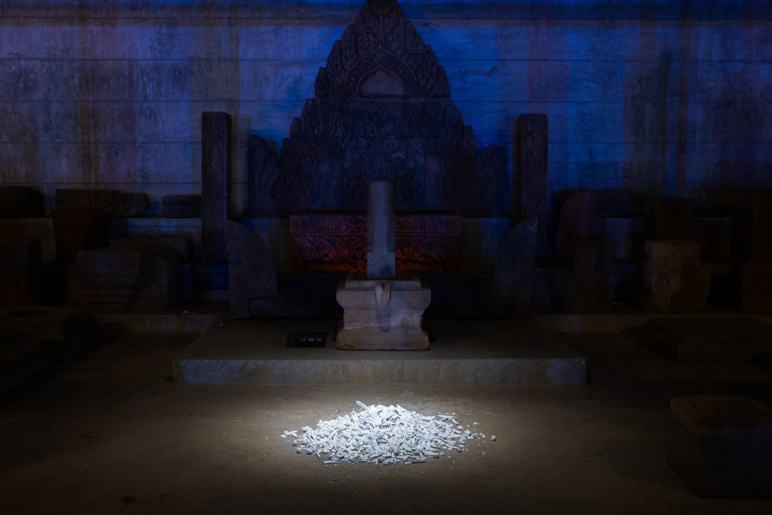 The curators had invited a new sound artist duo, PLERN VERN, to join this season. The duo installed movement censors in the open storage of Phimai National museum around Kala. Upon detecting a change in light and shadows, the duo’s composition would start to play on loop.