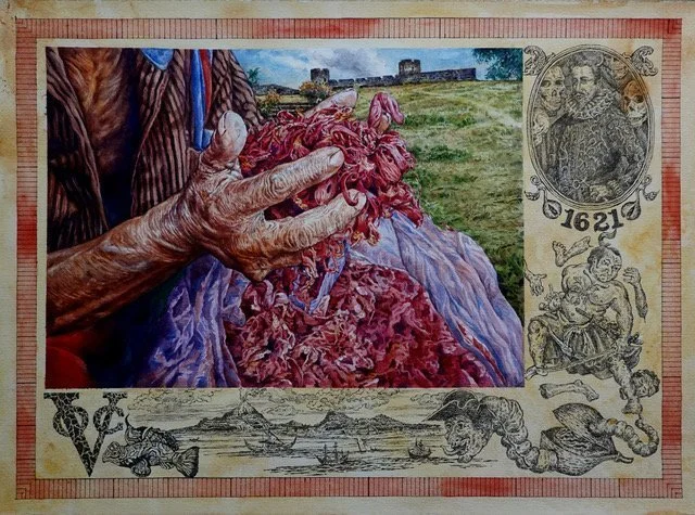 Chang Fee Ming’s two works, In Search of Native Bandanese and Remembering 8 May 1621, likewise demonstrate the potential for the intense and solid application of watercolour to assert the imperative of remembering and retelling colonial histories. In both paintings the sizzling red of nutmeg skin and clotted touches of sweat on his figure’s foreheads offers us these histories with a startling realism. They elaborate on the history of Pulau Banda in Indonesia that marked the beginning of Dutch colonial expansion in Southeast Asia and the massacre of the Bandanese Orang Besar in 1621. Remembering 8 May 1621 weaves the story of the day where forty-four Bandanese chiefs were beheaded or quartered at Fort Belgica at Pulau Banda, placing in the foreground the island’s flourishing nutmeg trade which was claimed by the Dutch VOC and for which the Dutch continued the systemic decimation of the local Bandanese. In Search of Native Bandanese jolts us to the present day where the artist presents portraits of locals living in the islands, captured during his trip in 2019 in his search for the dwindling native Bandanese population amongst the islands’ multiethnic population today. Chang’s visceral treatment of his subjects with their steroid veins and saturated skies is an urgent plea for our attention and consideration for the lessons we have gained from this history and, today, how we reflect on the actions of our former colonisers.