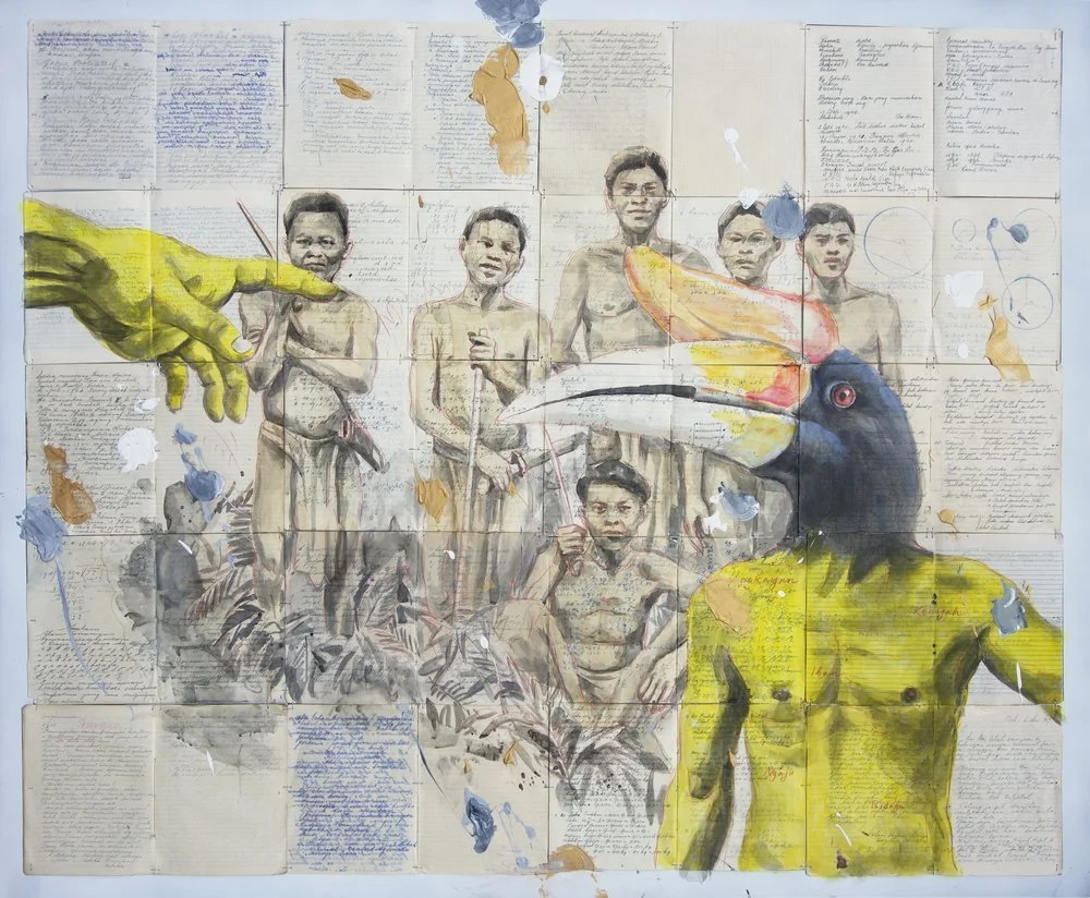 Agus Suwage, Borneo - The Missionaries and The Hornbill, 2021, watercolour, ink, tobacco juice, acrylic on old note student book, 113 x 137cm. Image courtesy of A+ Works of Art.