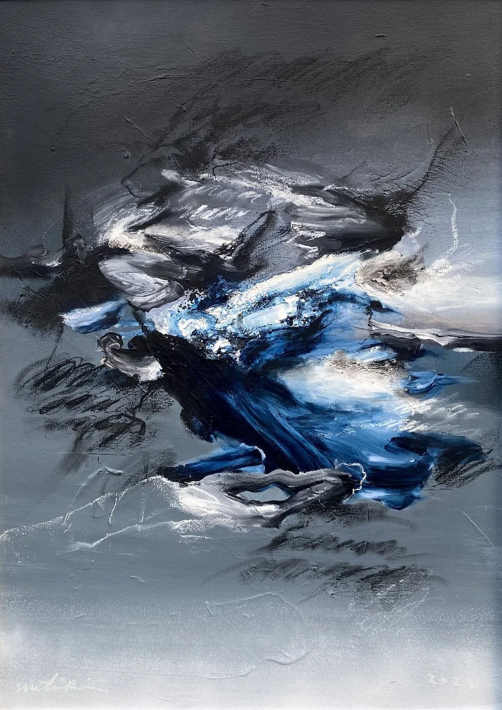 At the end of a short hallway, Black Waves (2023) by Mutiara Riswari is the visualisation of the tumultuous clash happening inside ourselves when we face loss and separation. Here, the colour black does not only represent lament, but also the robustness that comes from weathering it. Like the ocean separating Mutiara from her father, who moved to a different continent, it also still connects her to the tender memories of joy. This dichotomy is another stage of grief where one is supposed to move on but does not want to let go of the past. Eventually, Fog Shrouded (2023) is her way of coming to terms with an uncertain future. We can wish and plan all we want, but there is still an unpredictable darkness that looms at the top of the hill. She goes on to portray her own turbulent self intimately in meditative charcoal and pastel smudges in Silent Harmony (2023).