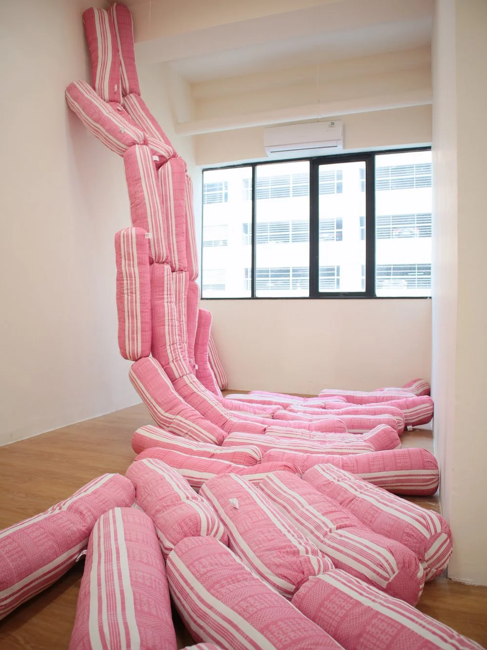 The gaps between the bolsters are hollow spaces when things fall through, similar to how we overlook bad things of the people we lost because we are expected to forgive all of their mistakes. She invites the audience to walk on the soft sculpture and feel the wobbly insecurity of the many stages of grief, peek through the narrow gaps between the bolsters to see a future where death is imminent, or lay down and embrace the stage where one lets go the tense emotion and is lulled by the waves. The smell of kapok, or cotton, fills the air. It is a scent that many would associate with comfort and sleep.