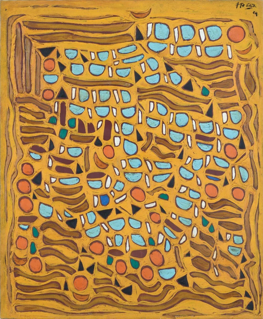 However, one will notice a significant shift in the artist’s approach to painting before and after his time abroad. Abstract paintings executed before 1968 tend to feature biomorphic forms created by joining various shapes on top of each other. The compositions are often dominated by a central form, with an overall impression of being grounded or heavy. There is a clear development of paint layers which correspond with the visual mass of the elements in his paintings. For instance, blocks are outlined with thick impasto strokes which further reinforce their weight.