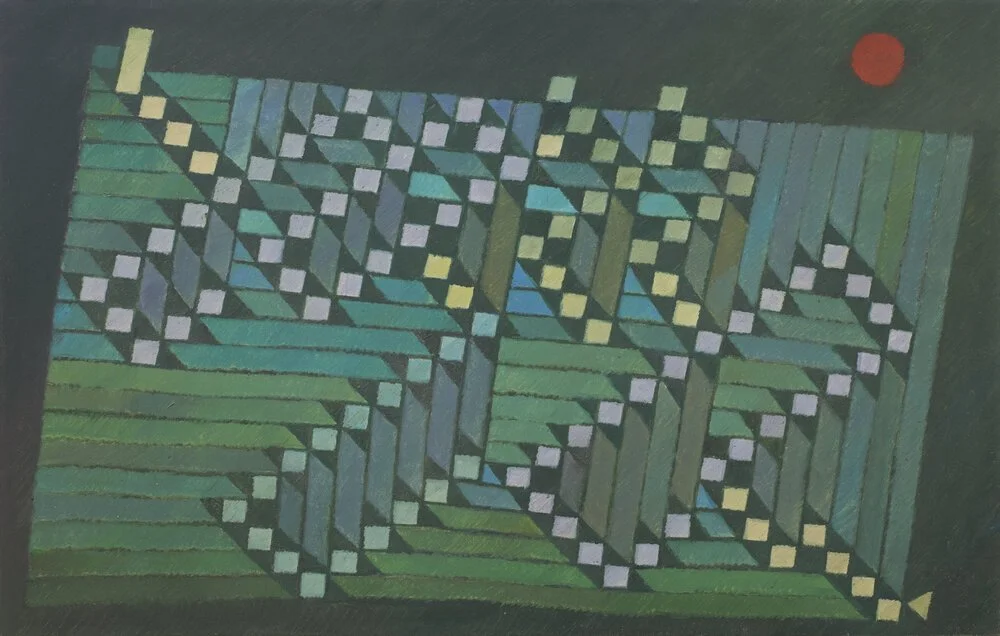 Fadjar Sidik preferred to call his abstract compositions “designs”. Indeed, the artist’s mature phase features a highly graphic style which evolved over time in different series. Each series was an extensive exploration of arranging specific shapes into different compositions and colour variations. They were given loose titles such as Metropole, Mandala, Lurik and Sangkala, which seem to point towards associations between the material and urban, and the immaterial and cosmological. Recalling Baxandall’s call to interpretation, how might one infer artistic intention behind these patterns?