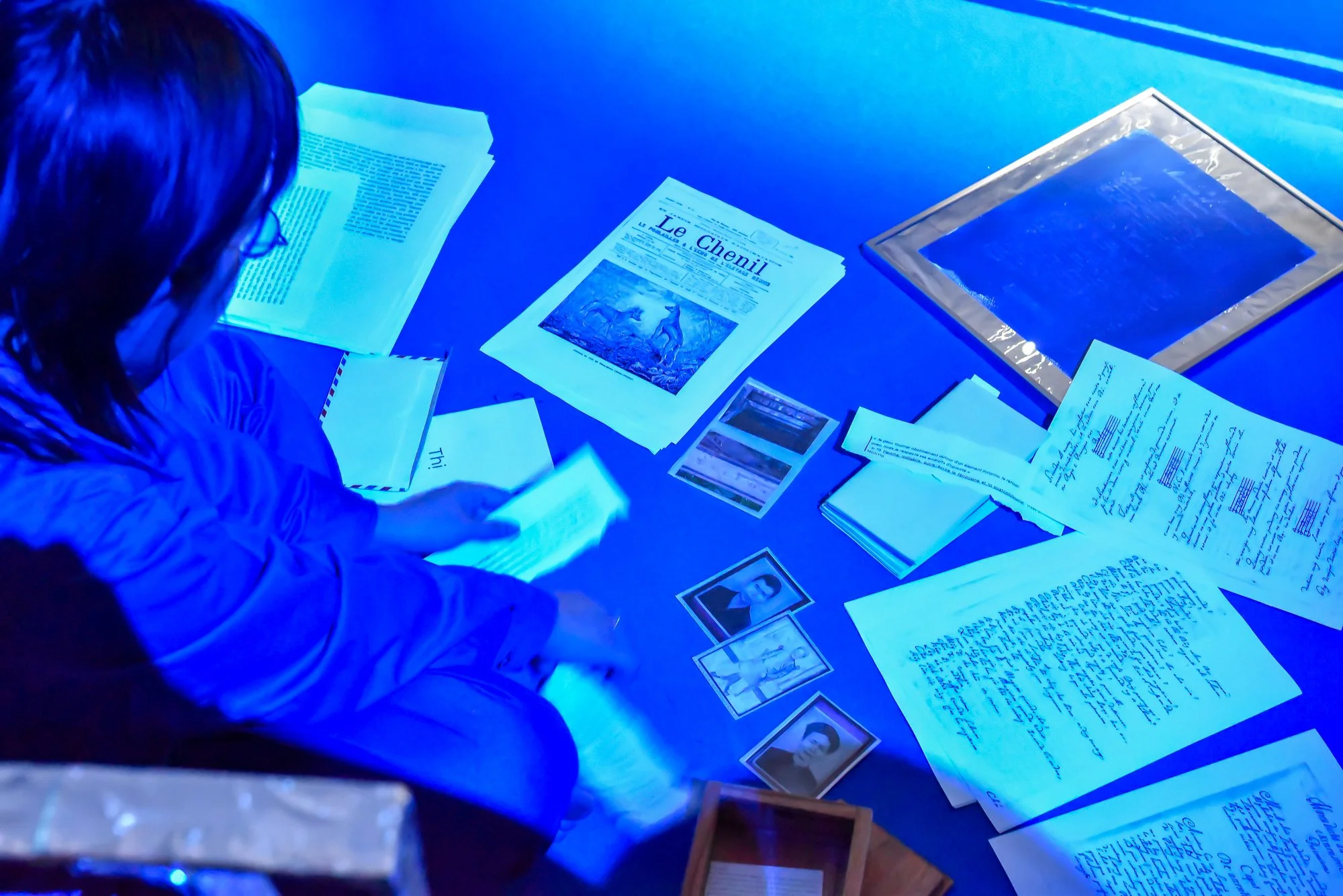 When first presented in 2023 at the École Nationale Supérieure des Arts Décoratifs de Paris (ENSAD), the installation Bố không biết mình đang ở đâu (I [the father] don’t know where I am) (2023) featured three performers dressed in blue reciting a poem in turn, each in a different language: Vietnamese, English, French. The text unfolded but the meaning of the words slipped away in fragments, leaving the audience suspended in the fissure between languages, experiencing the untranslatable. From a suitcase, the artist drew drawings, books, photographs. Nothing resembling a demonstration, a narrative, let alone an explanation. The gesture evoked instead an opening, an offering, an intimate sharing. In that moment, it became clear that this garden was not a backdrop but a place where one opens to memory, to silence, to forms that refuse explanation.