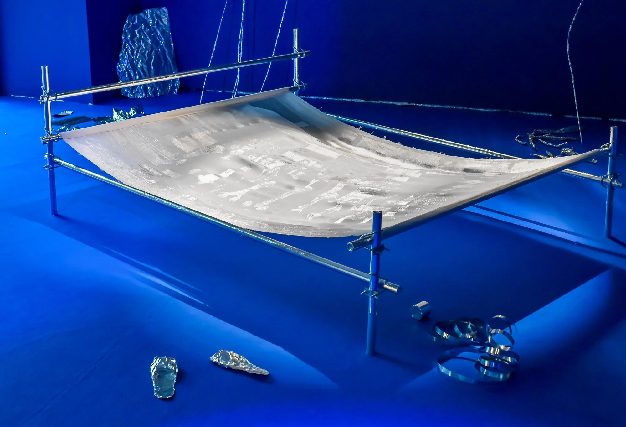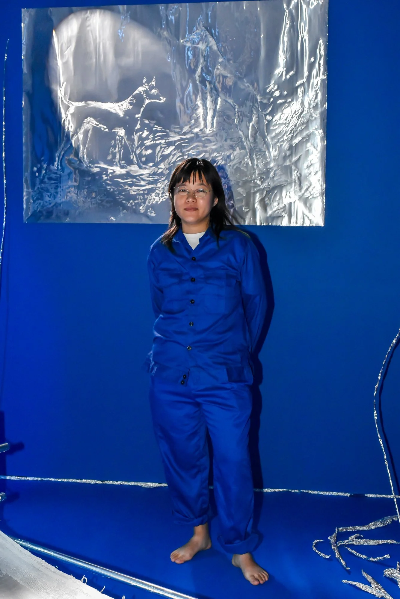 Hằng Hằng calls her installation a “garden”. The word feels familiar, reassuring, but nothing here resembles a place of greenery or rest. The gallery is immersed in an intense saturated chroma-blue, the very same blue once used for video backdrops. One feels that everything here could be erased, replaced, rewritten.