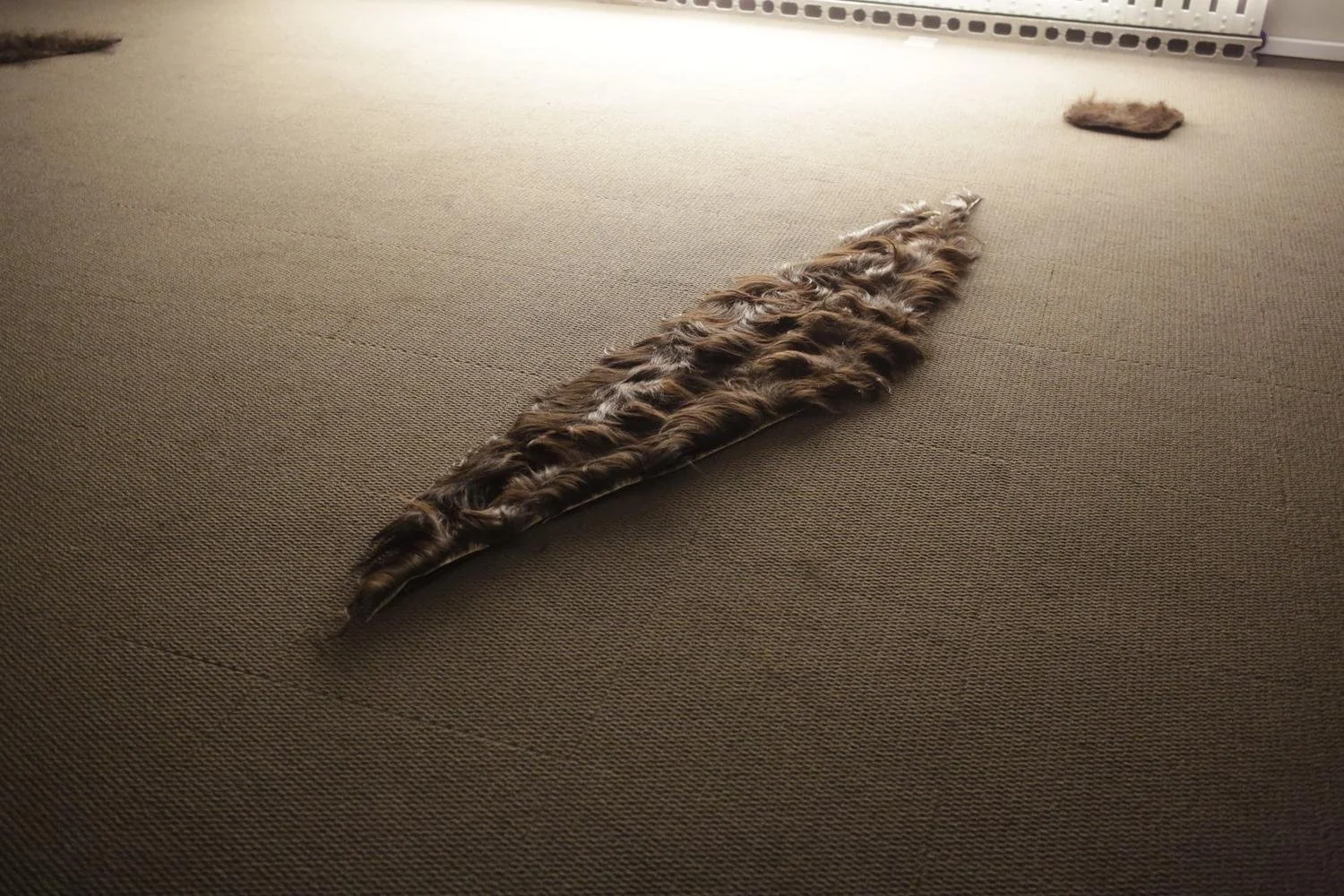 Hằng Hằng, Unforgotten land, 2025, hair, faux leather fabric, dimensions variable. Installation view in Setouchi Triennale (2025) at Kagawa Museum in Takamatsu, Japan. Image courtesy of the artist.