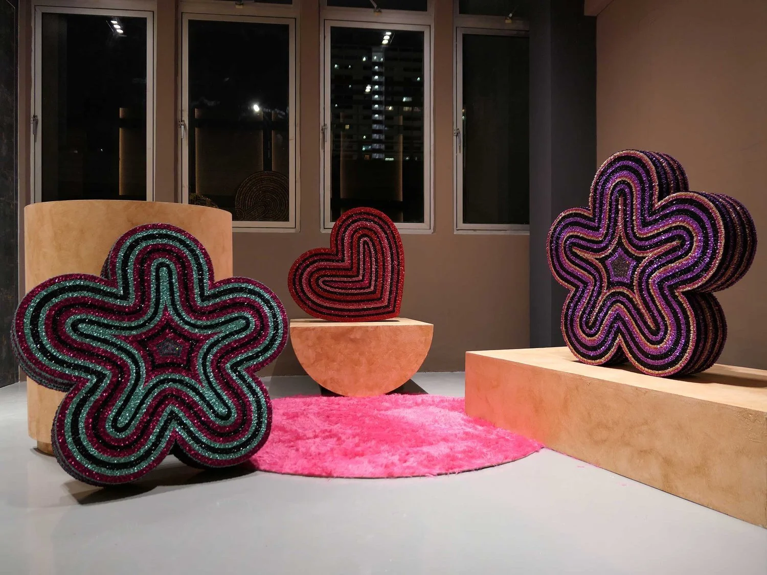 On the floor is a cluster of sculptures including Psycho Ornamental Ideal Boyfriend II and Old Habits Cry Hard. They cast their spell of glitter and shadow against the backdrop of the dull highway seen through the window. This placement allows for us to appreciate these sculptures in their bright joy, while tempering the experience with the sober throb of reality, an artistic decision particularly apt for works that tackle heartbreak through aesthetic extravagance.