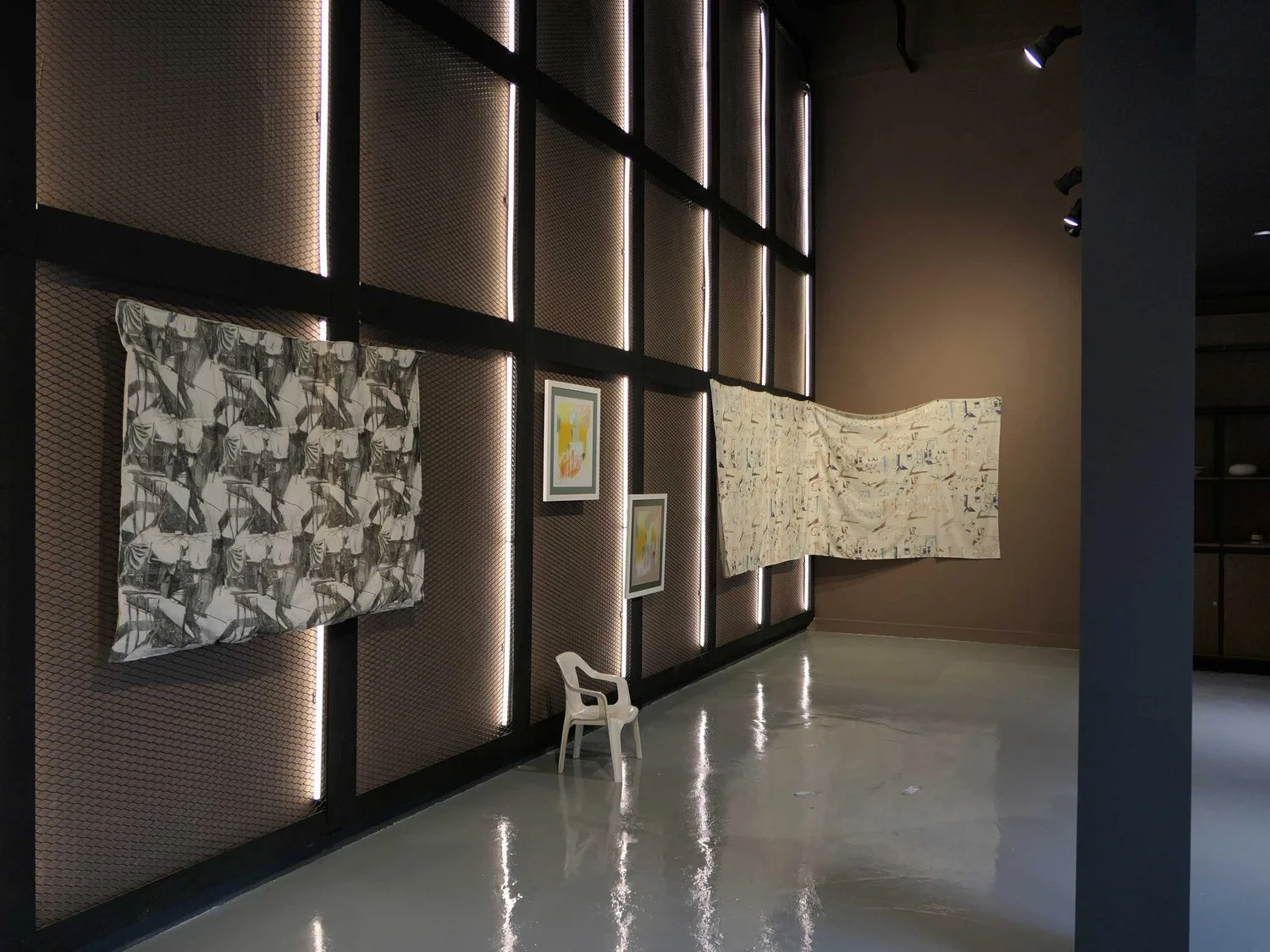 The AMSR space is ultimately a far cry from the coffee shops, alleyways, and apartment rooms featured in Ting Yan’s work. Her placement of a plastic chair opposite the Barcelona chairs in the space is a stark reminder of that. Yet as viewers observe my plant is dying, they are inevitably transported. The medium is a linen sheet capturing images of different rooms and snippets of conversations between friends. The piece hangs across the two walls so that when the viewer stands in front of it, they are enveloped on both sides. At eye level, the dialogue between two unseen friends reads: “If you could spend a moment with God, how would it look like?” asks one, “We would sit by the lake, and He would hold me, and we would just hang out,” reponds the other. A sliver of light passes through the cloth and for a moment, a whisper of transcendence creeps in – comforting as a worn blanket, gentle as a friend reaching for your hand.