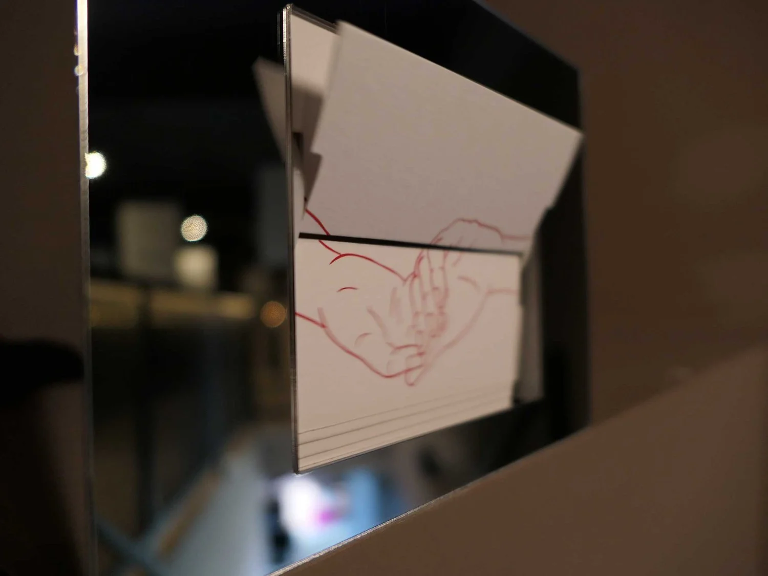 Despite the overt explorations of spirituality, at the heart of the presentation is a concern with human connection. The song Tuhanku, Bila Hati Kawanku in This Side of Heaven translates to If I Have Wounded Any Soul Today. Bookending the exhibit are the automated flipbooks Songs of Companionship #1 and #2 which capture hands in perpetual motion as they hold each other, highlighting human affection as an act of mutual faith. Even the words that have been cut out from Other Things have been left in front of Homebound, a line etching of people huddled together in a cemetery in Bangka Island, where the artist’s father had grown up, and where Jevon first visited to attend his uncle’s funeral. These paper scraps are both offerings to the dead and a reminder that our dealings with doubt can ultimately form the crumbs needed to mark our journey home.