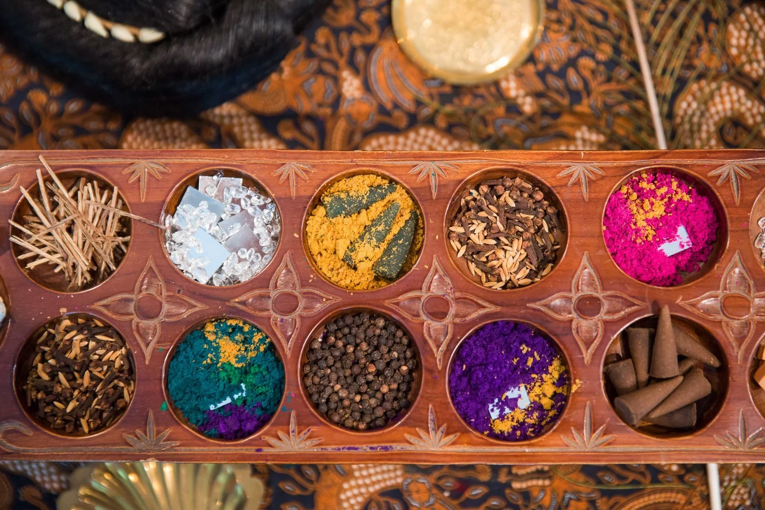Zarina Muhammad, Pragmatic Prayers for the Kala at the Threshold (detail), 2018, bamboo, sandalwood, clay, stone, turmeric powder, sandalwood powder, saffron, nine grains and spices, rose water, incense, glass jars and paper, dimensions variable. Image courtesy of Singapore Art Museum.