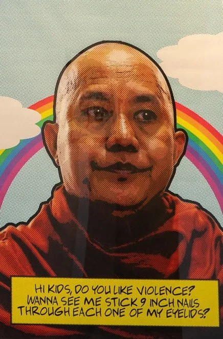 Prints by street artist Bart Was Not Here feature a pop art style reminiscent of the American print revival, transplanting the headshots of notorious figures such as Ashin Wirathu, Ne Win and Tan Shwe onto colourful, graphic backgrounds. What results is a jarring contrast between the undercurrents of violence that mark these personalities, and their visually cheerful framing that signifies all at once an explicit irreverence, mockery and a thinly-veiled censure against the brutal strictures they impose.