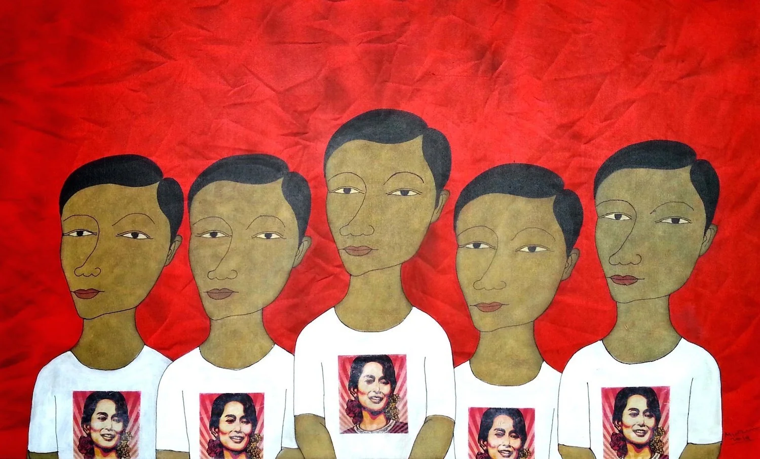 Notably, Min Zaw’s The Loss of Identity features his idiosyncratic, elegant line drawing of people found in his earlier series Women, placed against a red background. Yet, the intended effect is not to accentuate the serenity and sensuality of his characters. On the contrary: the uniform faces sporting identical shirts with Aung San Suu Kyi’s face on it are a disarming look into the pessimism and discomfort of his generation that have grown up within a political atmosphere of dispossession and violence.