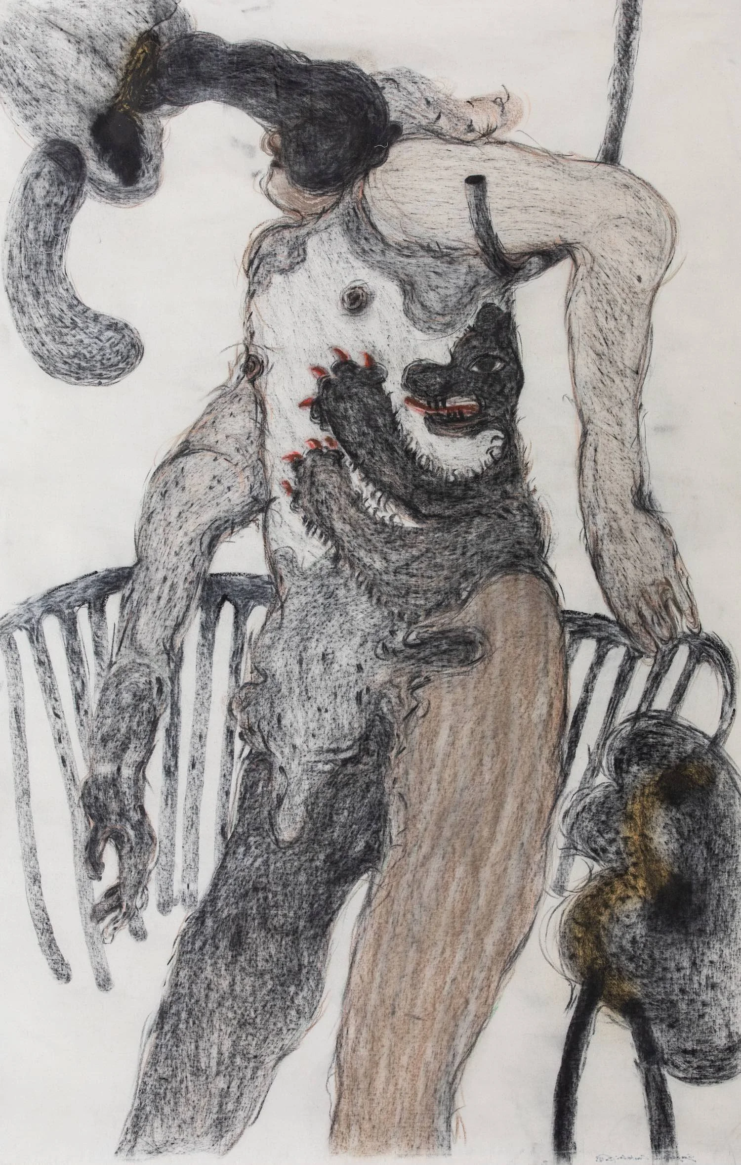Meanwhile, from Italian artist Guglielmo Castelli’s warped exploration of the human body — somewhat incongruously represented in crayon — to Germany’s Kerstin Grimm, who creates a post-apocalyptic world upon which humans are quite literally built, the show pieces together a dark, chaotic alternate reality that unsettles and discomfits — and is difficult to unsee.