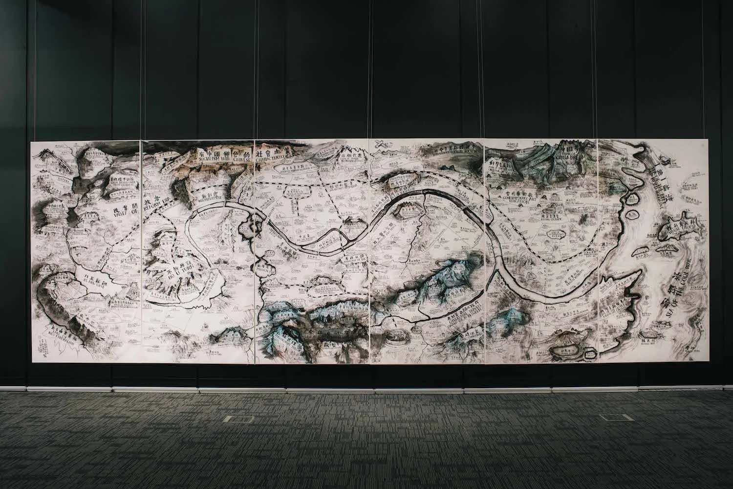 Installation view of Qiu Zhijie, Map of Art and China after 1989: Theatre of the World, 2017, colour print, 240 x 720cm. Image courtesy of Parkview Museum Singapore.