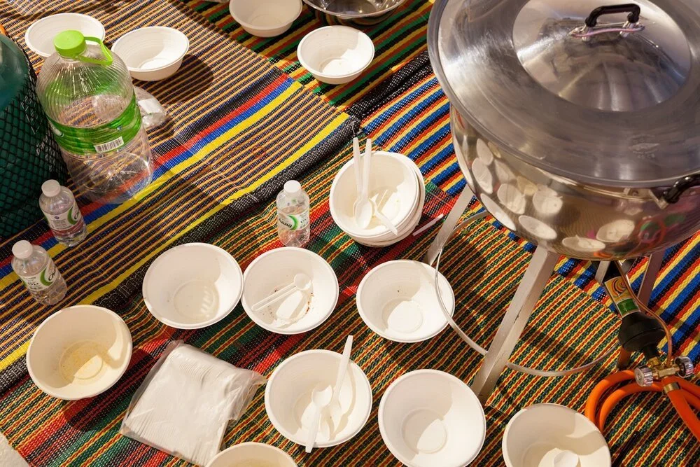 Rirkrit Tiravanija, untitled (2004), jed sian samurai 2019, 2019, 7 gas burners, 7 pots, bowls, ingredients, cooking equipment and utensils, mats, dimensions variable. Image courtesy of BACC.