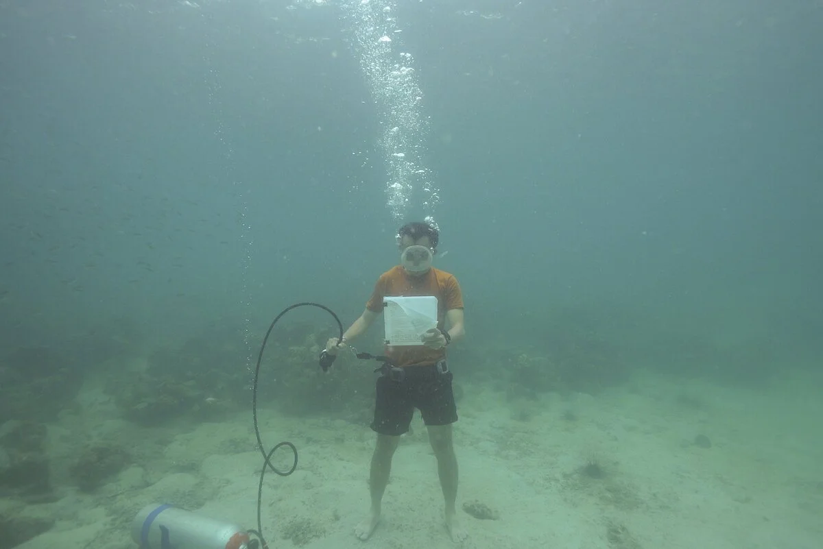 Lim Sokchanlina, Letter to the Sea (video still), 2019, video installation: transparency, scuba mask and flippers, installation dimensions variable, video duration 17 min 35 sec. Image courtesy of the artist.