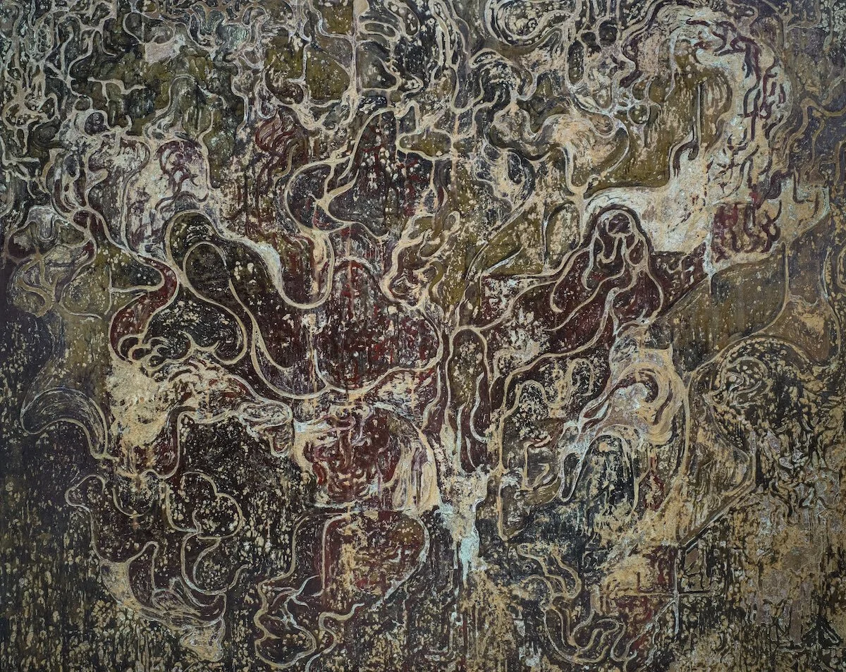 Conceptualisation aside, Seah’s formalistic strengths are also showcased through intricate compositions. The artist employs a mix of oil, acrylic, bitumen, vinegar, latex, liquen and fire through a meticulous process of tarnishing, sanding, carving, masking, etching and painting. The result is a mesmerising textured landscape, melding together such that it is hard to tell where each technique begins and ends. Some images flow like streams of water that diverge and converge, while others display more frenetic movements through tight curves and swirls. While the titles in English attaches the form of the image to individual nephological cloud types, the ones in Mandarin titles provide some clarity by alluding to an expression or a state of mind that matches the aesthetic of the works.