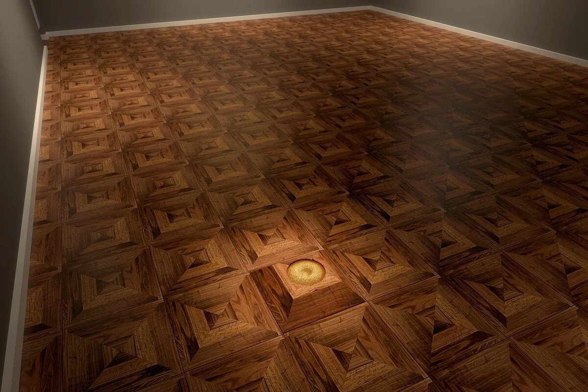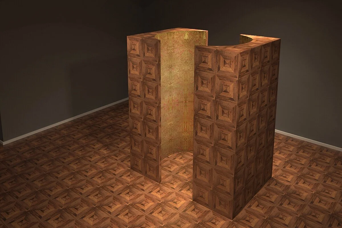 Accompanying the copper works are two site-specific installation works. Capsule is modelled after the standard size of a capsule hotel. The external structure matching the motif of the gallery’s wooden flooring, while the internal structure consists of Seah’s clouds painted and etched onto copper sheets. Seah thus reimagines the confined space from one of loneliness towards one of for solitary spiritual reflection. ... And we meet again utilises the same motif of the gallery’s wooden flooring, a kinetic sculpture that reflects the artist’s contemplation of the future and the cycles of time. Both works recentre the audience within the physical space of the gallery, calling for their presence away from the metaphysical imaginings of the clouds.