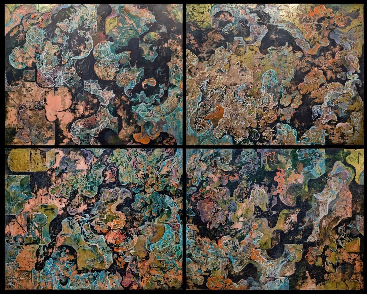 Zelin Seah, Cloud: Please Update The System, 2019, mixed media with etching on copper, 232 x 292cm (4 panels). Image courtesy of Richard Koh Fine Art.