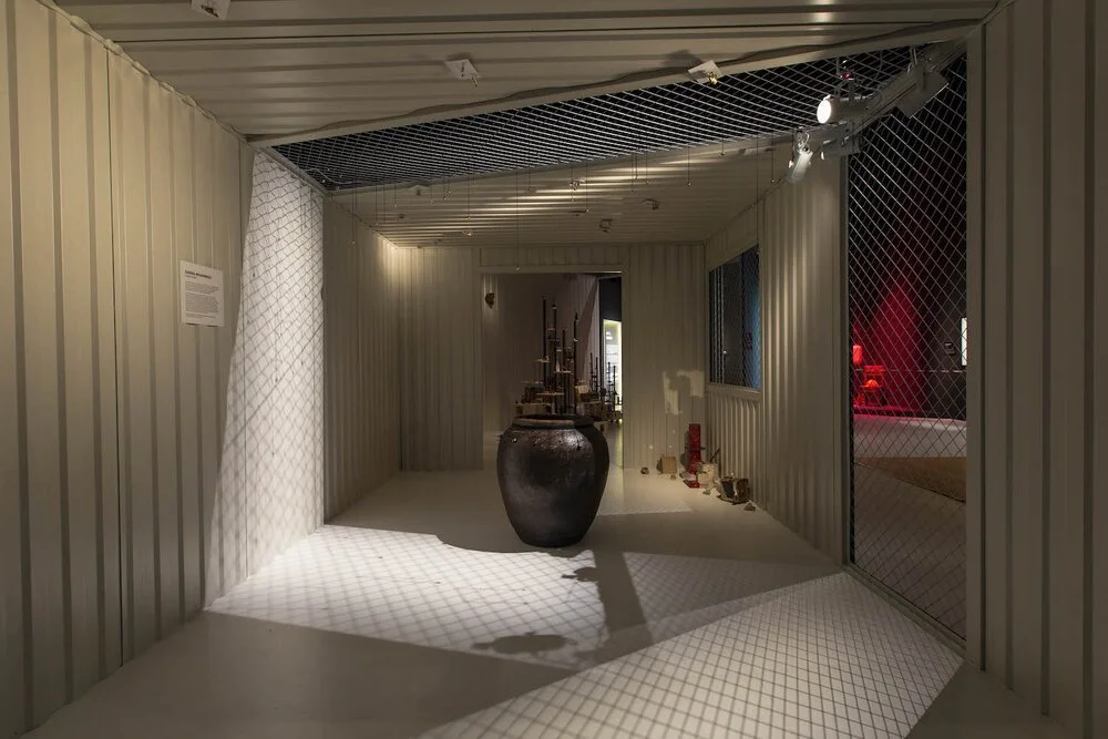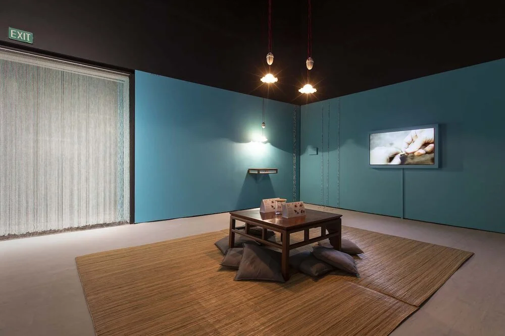 Act V: Memory is arguably the strongest section following Act 1: Arrival. All the artworks connect with each other well, echoing similar ideas about the importance and implications of our social and cultural memory, thus creating a conceptually concise space. It begins with Larry Achiampong’s Relic Traveller 0, 1 and 2, a series of video works that combine Afrofuturist imagery with masterful prose written from a postcolonial perspective. Following Achiampong comes Zarina Muhammad’s Calendrical Systems for the Afterlife, a shrine that honours the spirits of past and present while questioning the space for rituals and rites in the Anthropocene. The next slew of installations mark the end of the journey by returning to the present, with Priyageetha Dia’s documentation of Golden Staircase and Gold Flags, Yanyun Chen’s 娘 niang (wife) and Amanda Heng’s Another Woman No. 2, a reminder of current-day issues while we look forward to the future. The exhibition ends with Adeline Kueh’s interactive Everything but Gold, calling for visitors to pen their wishes for the future onto strips of paper. These are subsequently rolled into beads and strung up as beaded curtains—an homage to the artist’s heritage that simultaneously acts as a metaphor for hope.