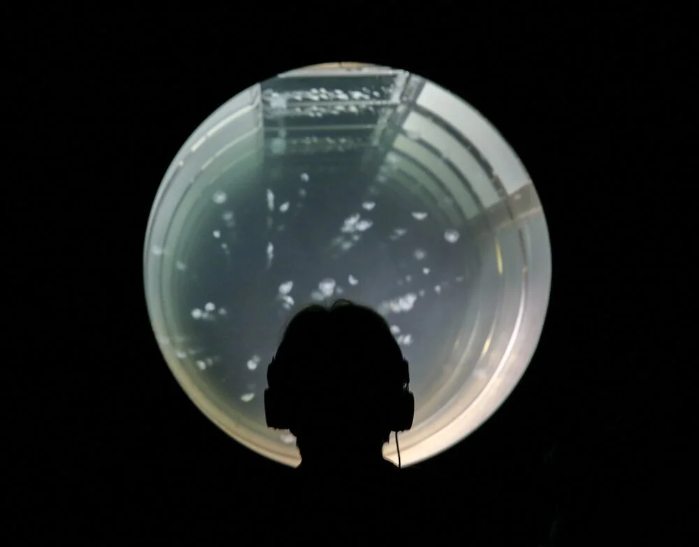 Act IV: Adaptation is the smallest section with the most ambitious ideas, centering on Rimini Protokoll’s win><win, an interactive installation that imagines a future dominated by jellyfish, as the acidified and warmed seas allow for this species to thrive. The installation is meant to be immersive and thus visitors are split into groups before they are allowed to enter the installation space, restricted to short windows of time to experience it. The installation is accompanied by Bao Songyu’s Museum of Marine Life, a series of kinetic sculptures modelled after marine specimens, along with Shan Hur’s quirky Ball in the Pillar.