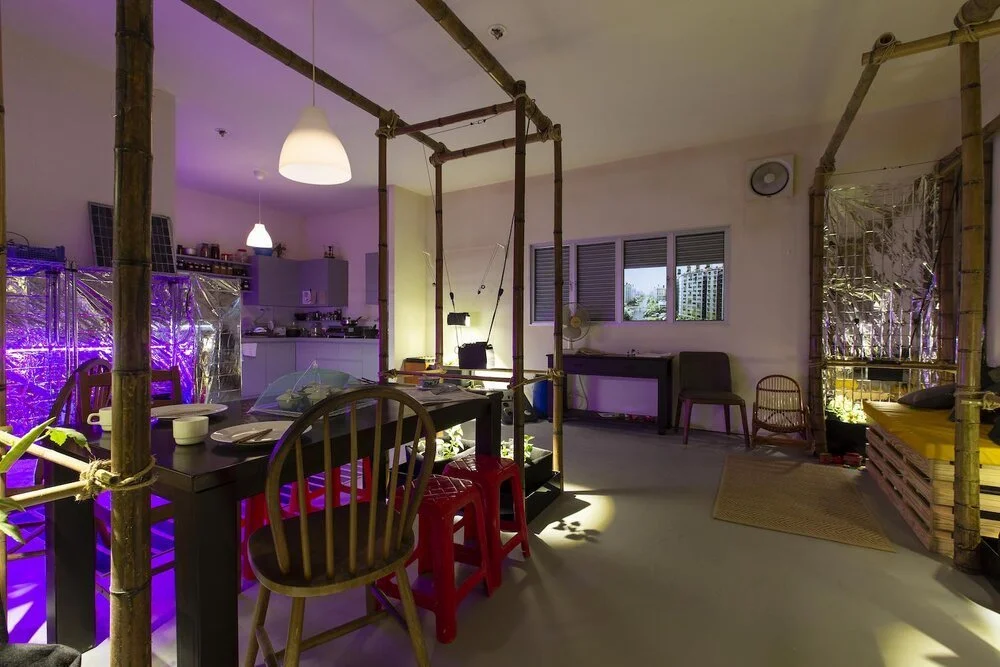 Act II: Home addresses the immediate changes that may come, a future that is closer to present times. Mitigation of Shock (Singapore Edition) by Superflux reflects the possible grim realities of climate change while emphasising human ingenuity. The installation is an apartment that visitors can walk through, complete with a kitchen, a living space and a dining table. The familiar touches of home juxtaposed against reflective aluminium and bright neon lights present a version of the future that is alienating and yet still familiar. Right next to Superflux stands Hafiz Osman’s The Penghulu (Village Chief). The artist introduces the tall bike as a possible mode of transportation in the future, given Singapore’s susceptibility to rising sea levels. The artwork’s name adds an endearing sentiment, a Malay title given to the chief of a village. The title has more significance in Singapore, recalling the settlements and villages from the southern coasts of Singapore, where penghulus were respected and important individuals. Although simple in its making, the artwork’s title is a subtle allusion to Singapore’s history as an islandic nation, while also bringing forward this history into our possible future.
