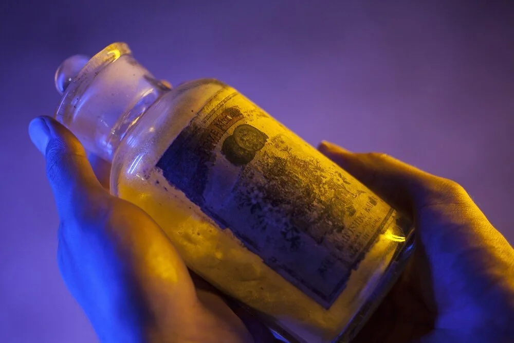 Ting Chaong-Wen, Virgin Land, 2019, tempered glass floor, ultraviolet light tube, neon lamp, raw material of cinchona tree, tonic water, multi-channel video, dimensions variable, exhibition installation view. Image courtesy of 2019 Asian Art Biennial.