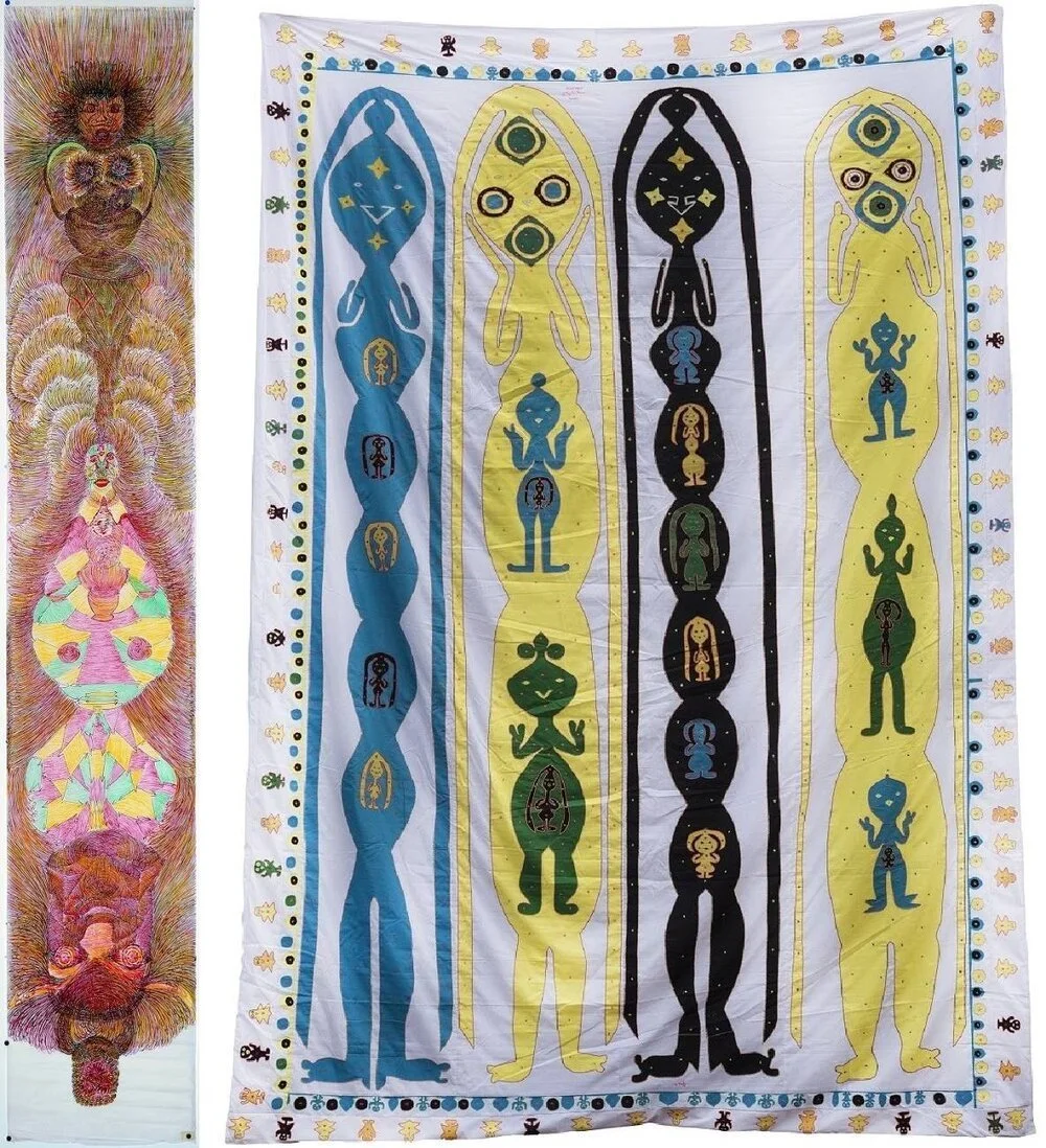 On that note, I do see how the artworks bring in multiple cosmologies. There were two works that were beautiful in their own right, and at the same time, I felt a conversation going on between them. One is by Chinese artist Guo Fengyi, Shaodian (Father of Yellow Emperor), and the other is by Hmong artist Tcheu Siong, Three Hmong Protectors 3. Conceptually and aesthetically, you can see some similarities, such as the motif of supernatural beings and employing a large-scale hanging presentation. The thing is that they come from two distinctly different worldviews. It’s a lovely visualisation of how multiple worlds can exist together.