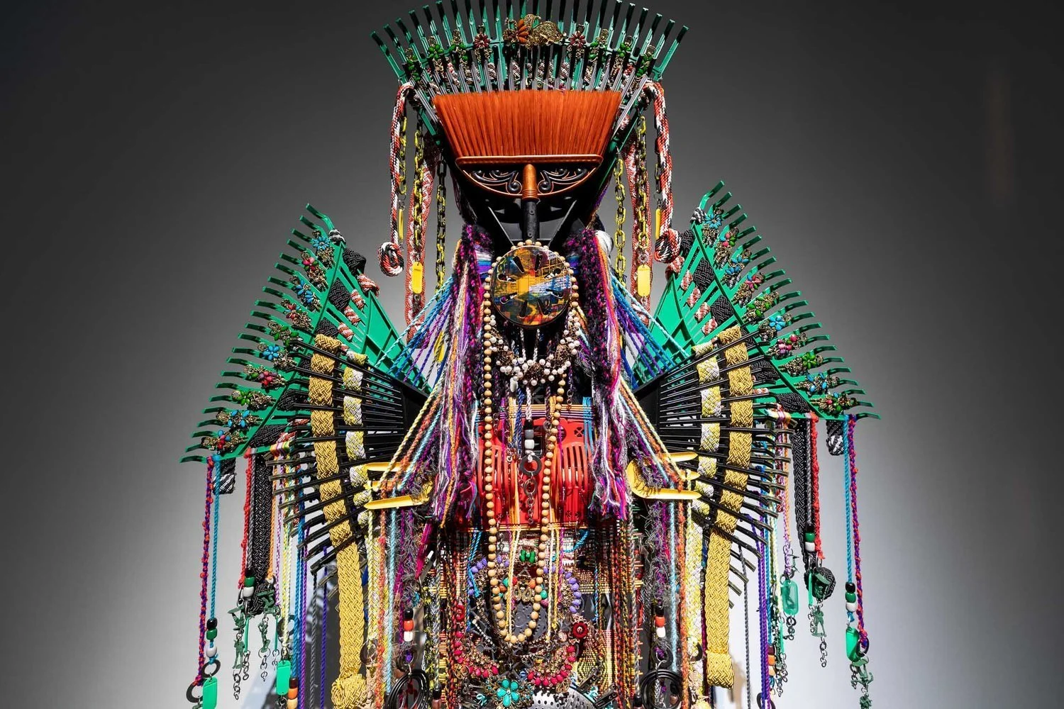 Anne Samat, Puteri 7 (Berselendang Koning / Seventh Princess with yellow scarf), 2018, rattan sticks, yarns, washers, rakes, PVC chains, home, fashion accessories, kitchen and garden utensils, stationary items, 224 x 122 x 30cm. Image courtesy of MOCA Taipei.