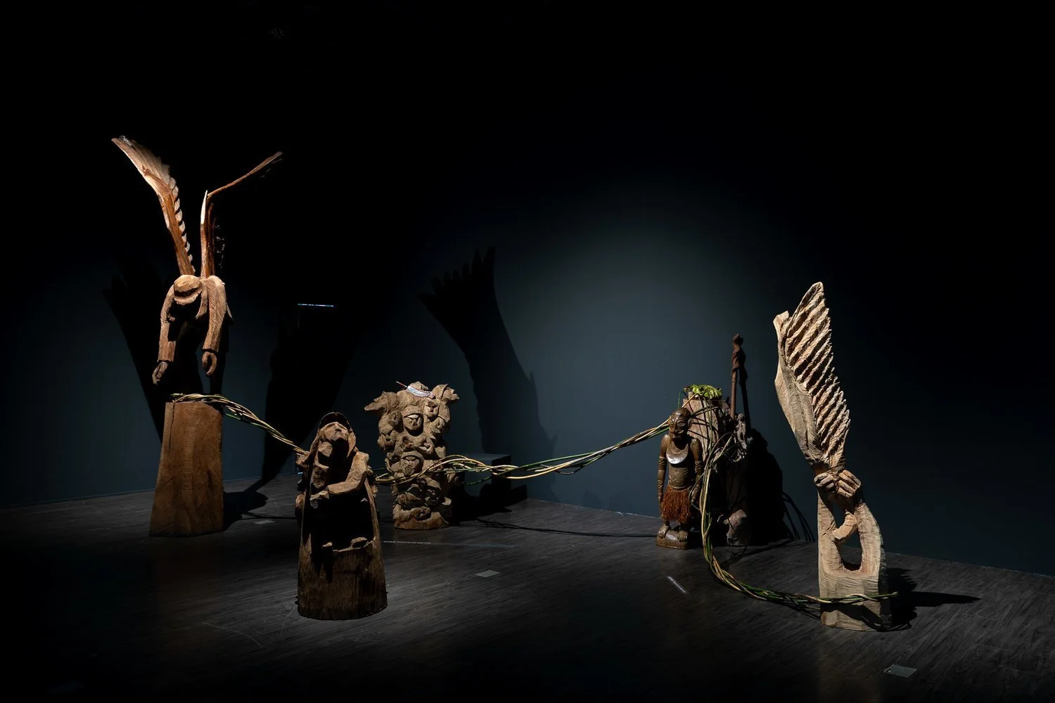 The exhibition also seeks to highlight ways in which islandic Taiwan shares colonial, maritime and genetic histories with the rest of archipelagic Southeast Asia. Siki Sufin's work addresses the forgotten history of Taiwanese indigenous soldiers, known as the Takasago Volunteers, sent to the most violent battlefield of the Pacific War in New Guinea during the Japanese colonial period. Tracing their journey to New Guinea and working with a local artist Papa David, these soldiers are evoked in the figure with spreading wings which symbolically brings home the souls of those who died in foreign countries.
