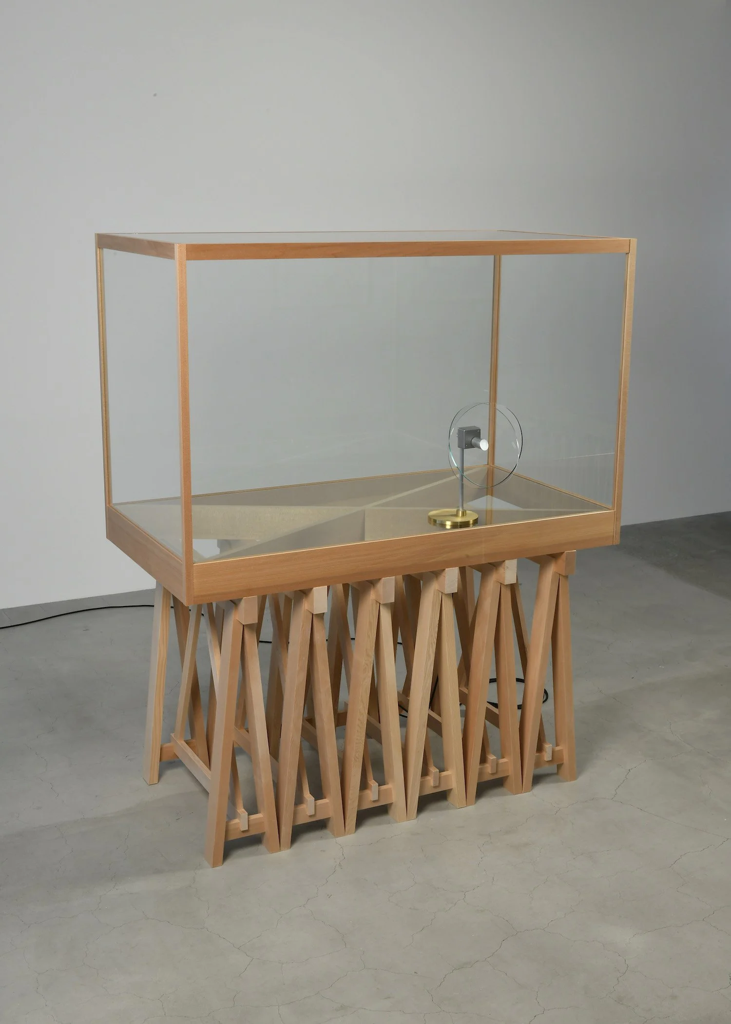 Tsuyoshi Hisakado, Tunnel #1 / Case, 2018, glass, wood, brass, aluminium, 172.8 x 74.2 x 141.2cm. Image courtesy of Ota Fine Arts.