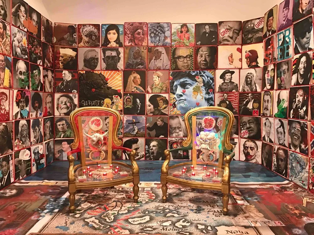 Anurendra Jegadeva, Yesterday, in a Padded Room, 2015, PVC cushions with printed and painted canvas, two painted thrones with perspex boxes, painted inserts and LED lights, printed floor covering on wood, dimensions variable. Image courtesy of the artist.